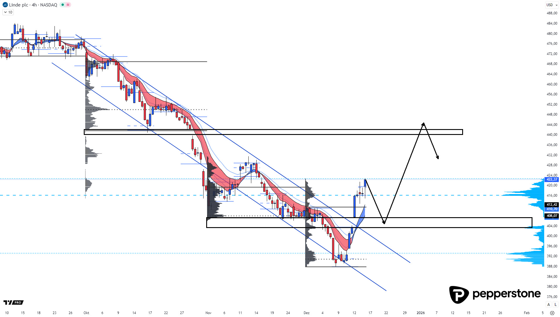 Volumen oberhalb der früheren Value Area ist ein zentrales Signal, denn es zeigt, dass Marktteilnehmer bereit sind, auf höherem Preisniveau aktiv zu werden. Genau hier liegt der entscheidende Punkt: Sollte sich dieses Volumen halten, spricht vieles dafür, dass die zuvor dominierende Abwärtsstruktur an Bedeutung verliert und ein neuer, aufwärtsgerichteter Kontext entsteht. Ein solcher Übergang von Ablehnung zu Akzeptanz ist häufig die Grundlage für nachhaltigere Trendbewegungen. Linde befindet sich damit an einer klassischen Schaltstelle zwischen altem Abwärtstrend und potenziellem neuen Aufwärtsimpuls.
