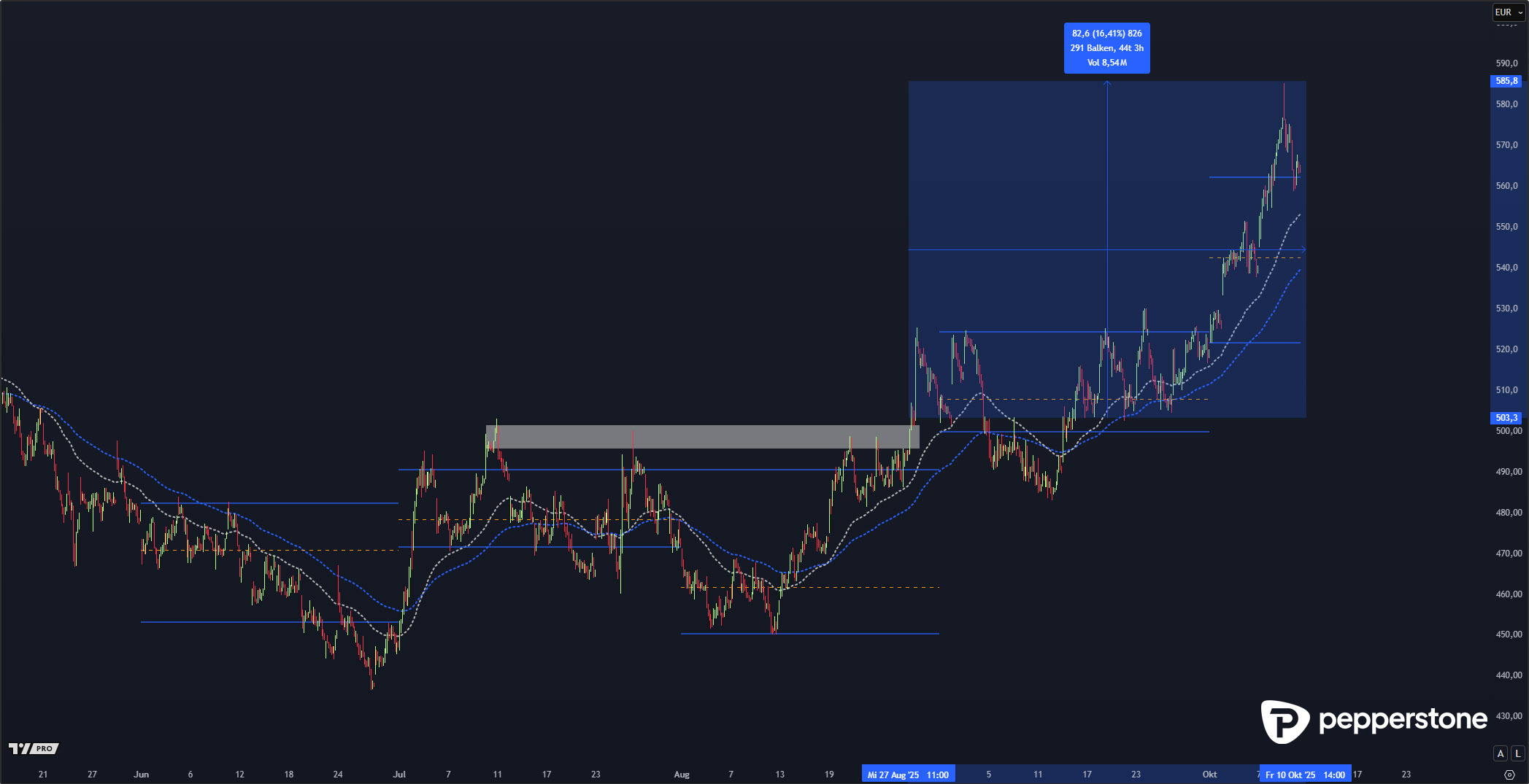 Für Trader bedeutet das: Ein klassischer Fall, bei dem ein untergeordneter Fehlausbruch am Tief die institutionelle Akkumulation markierte – und der eigentliche Impuls erst nach der Enttäuschung der Shortseite begann. Besonders interessant bleibt nun der Bereich zwischen 453 € und 457 €, dort liegt aktuell die untergeordnete Value Area Low. Sollte es zu einem Rücksetzer kommen, bietet sich hier eine erneute Gelegenheit für einen taktisch sauberen Einstieg.