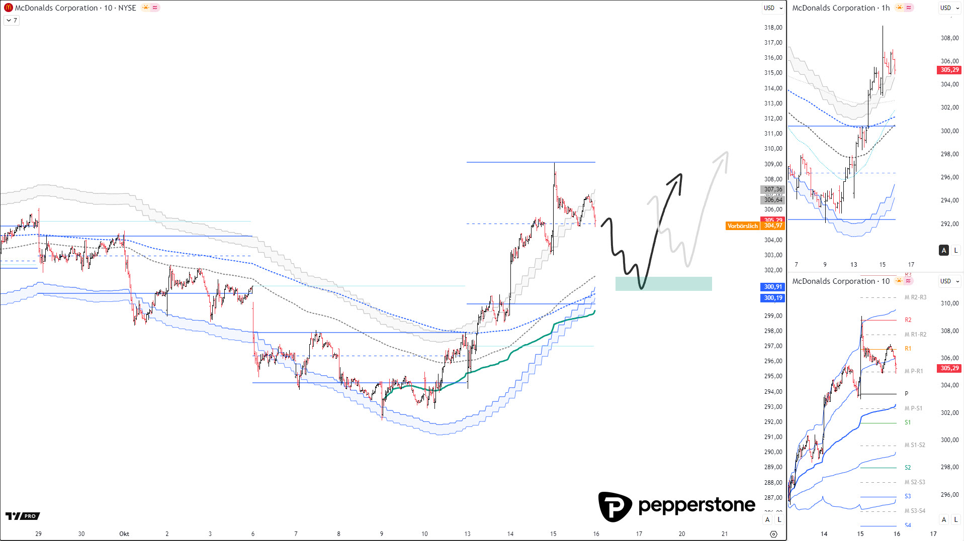 Das aktuelle Chartbild bei McDonald’s ähnelt strukturell den Setups, die bereits in früheren Analysen – etwa bei Starbucks, Rheinmetall oder Continental – zu beobachten waren. In allen Fällen entstand nach einer ausgeprägten Abwärtsbewegung eine neutrale Konsolidierung, gefolgt von einem neuen Trendimpuls. Dieses wiederkehrende Muster zeigt die typische Marktmechanik institutioneller Trendwechsel: Momentumverlust, Bodenbildung, Impulsaufbau. McDonald’s bewegt sich derzeit in genau dieser Phase – einer frühen Trendbestätigung mit klar definierten Reaktionszonen und stabiler Preisstruktur.