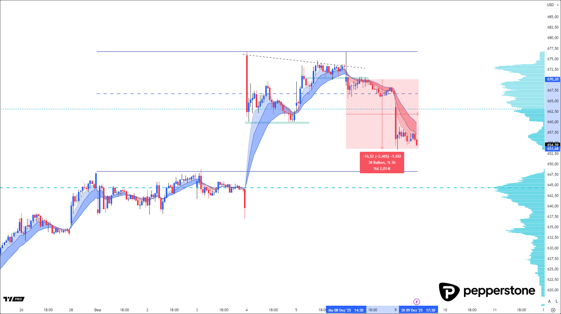 Die Value Area des Jahres erstreckt sich etwa zwischen 575 und 750 USD und markiert damit den Bereich, in dem rund 70 Prozent des gehandelten Jahresvolumens liegen. Dieser Abschnitt bildet den strategischen Bewertungsrahmen, innerhalb dessen institutionelle Akteure bereit sind, systematisch Kapital zu rotieren. Kurse darunter gelten als unfair und sind anfällig für Rückläufe, sofern der Markt im Rahmen der Price Action entsprechende Stärke ausbildet. Besonders interessant wird die Zone um 575 bis 590 USD, da sich hier die Value Area Low mit kleineren Volumenclustern überschneidet. Noch relevanter ist die Region um 550 USD, an der ein bedeutender volumengewichteter Durchschnitt (Anchored VWAP, November 2023) verläuft. Dieser Bereich dient häufig als mittelfristige Drehscheibe für Kapitalzuflüsse, wenn der Markt tiefere Korrekturen vollzieht. Auf der Oberseite rückt die Region um 675 USD in den Fokus. Sie bildet ein strukturelles Short-Cluster, das aus mehrfachen Reaktionen, lokalem Überangebot und einem klar definierten Monats-Volumenprofil hervorgegangen ist. In dieser Zone haben sich zuletzt wiederholt Abverkäufe etabliert.