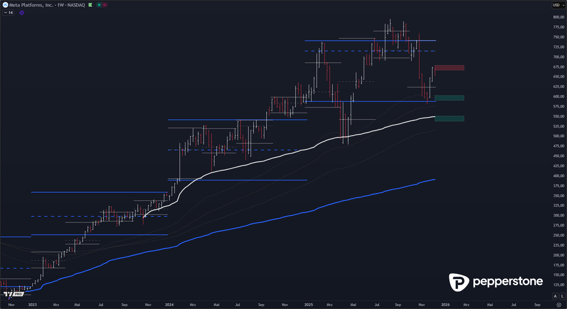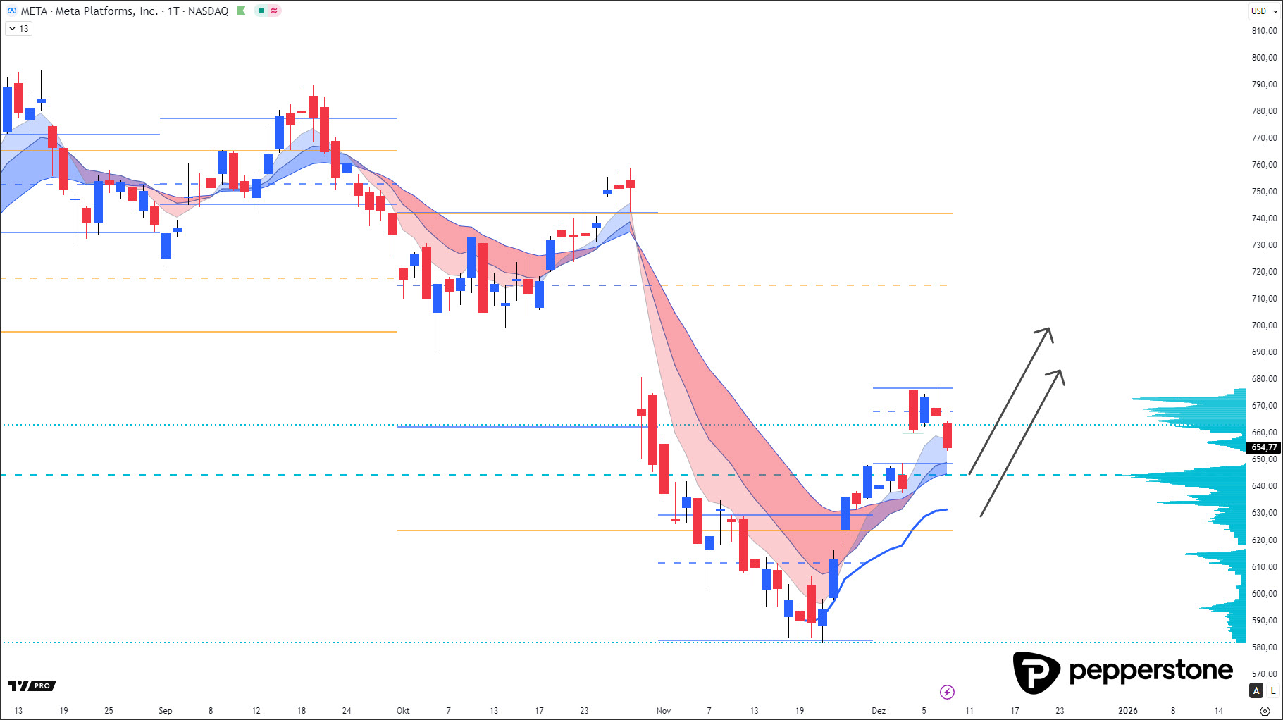 META gehört weltweit zu den meistgehandelten Aktien und wird daher von institutionellen Anlegern äußerst strukturiert bespielt. Diese Liquidität sorgt dafür, dass Volumencluster, Value-Area-Zonen und Anchored-VWAP-Bereiche deutlich sauberer reagieren als in vielen anderen Titeln. Die entscheidende Aufgabe besteht darin, zwischen Kontext und Einstieg zu unterscheiden. Der Kontext definiert die Bereiche, in denen ein Vorteil besteht, doch der Einstieg muss zwingend von der Marktreaktion abhängen. Diese Trennung verhindert nicht nur impulsive Fehlentscheidungen, sondern schützt auch vor dem psychologischen Druck, einen Trade erzwingen zu wollen. META bietet aufgrund dieser klaren Rahmenbedingungen ein präzises, sehr diszipliniertes Spielfeld für Intraday- und Intraweek-Setups und ist damit für Trader besonders wertvoll, die sich auf trend- und volumenbasierte Strukturen fokussieren.