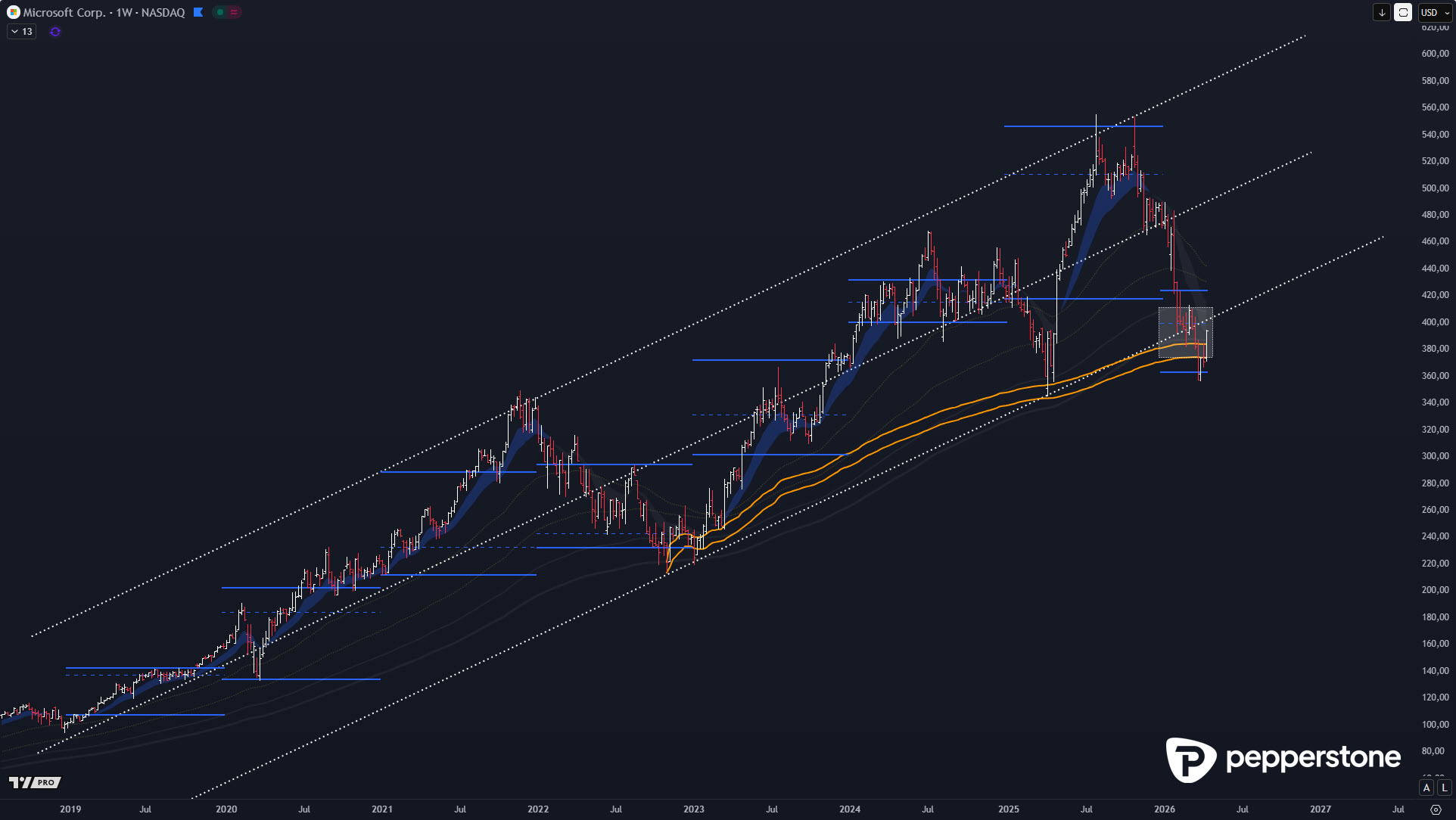 Microsoft reagiert derzeit bemerkenswert planbar im Bereich der gleitenden Durchschnitte, und gerade der 3- bis 4-Jahres-Durchschnitt ist aus Swing-Perspektive ein hochinteressanter Referenzanker. Aus meiner Erfahrung starten genau an solchen langfristigen Mittelwerten häufig die größeren Impulse, weil dort institutionelle Rebalancing-Logik und Mean-Reversion zusammenkommen. Hinzu kommt, dass die Aktie an die langfristige untere Trendkanalgrenze herangelaufen ist – damit verdichtet sich das Setup zu einem sauberen „Struktur-Cluster“, bei dem Preis, Durchschnitt und Kanalunterkante in dieselbe Richtung argumentieren.