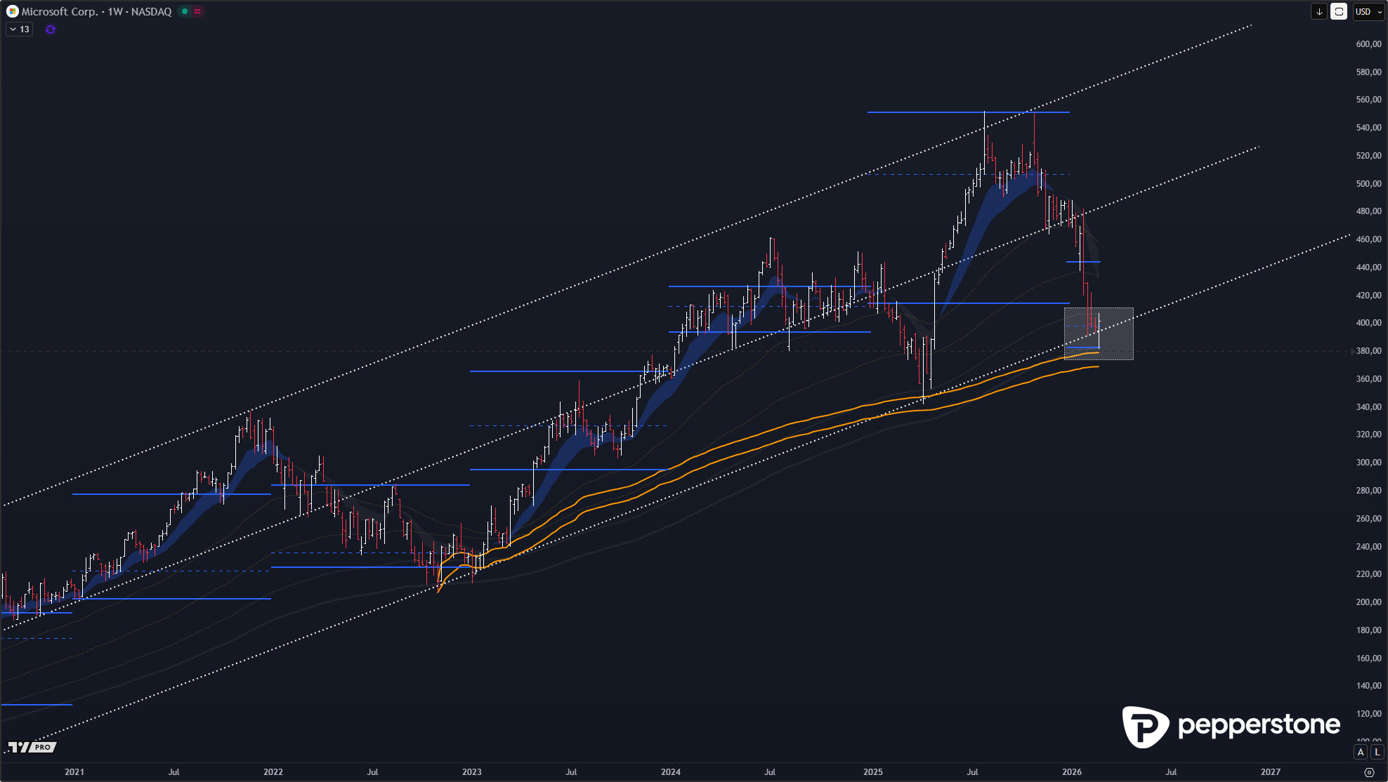 Microsoft reagiert derzeit bemerkenswert planbar im Bereich der gleitenden Durchschnitte, und gerade der 3- bis 4-Jahres-Durchschnitt ist aus Swing-Perspektive ein hochinteressanter Referenzanker. Aus meiner Erfahrung starten genau an solchen langfristigen Mittelwerten häufig die größeren Impulse, weil dort institutionelle Rebalancing-Logik und Mean-Reversion zusammenkommen. Hinzu kommt, dass die Aktie an die langfristige untere Trendkanalgrenze herangelaufen ist – damit verdichtet sich das Setup zu einem sauberen „Struktur-Cluster“, bei dem Preis, Durchschnitt und Kanalunterkante in dieselbe Richtung argumentieren.