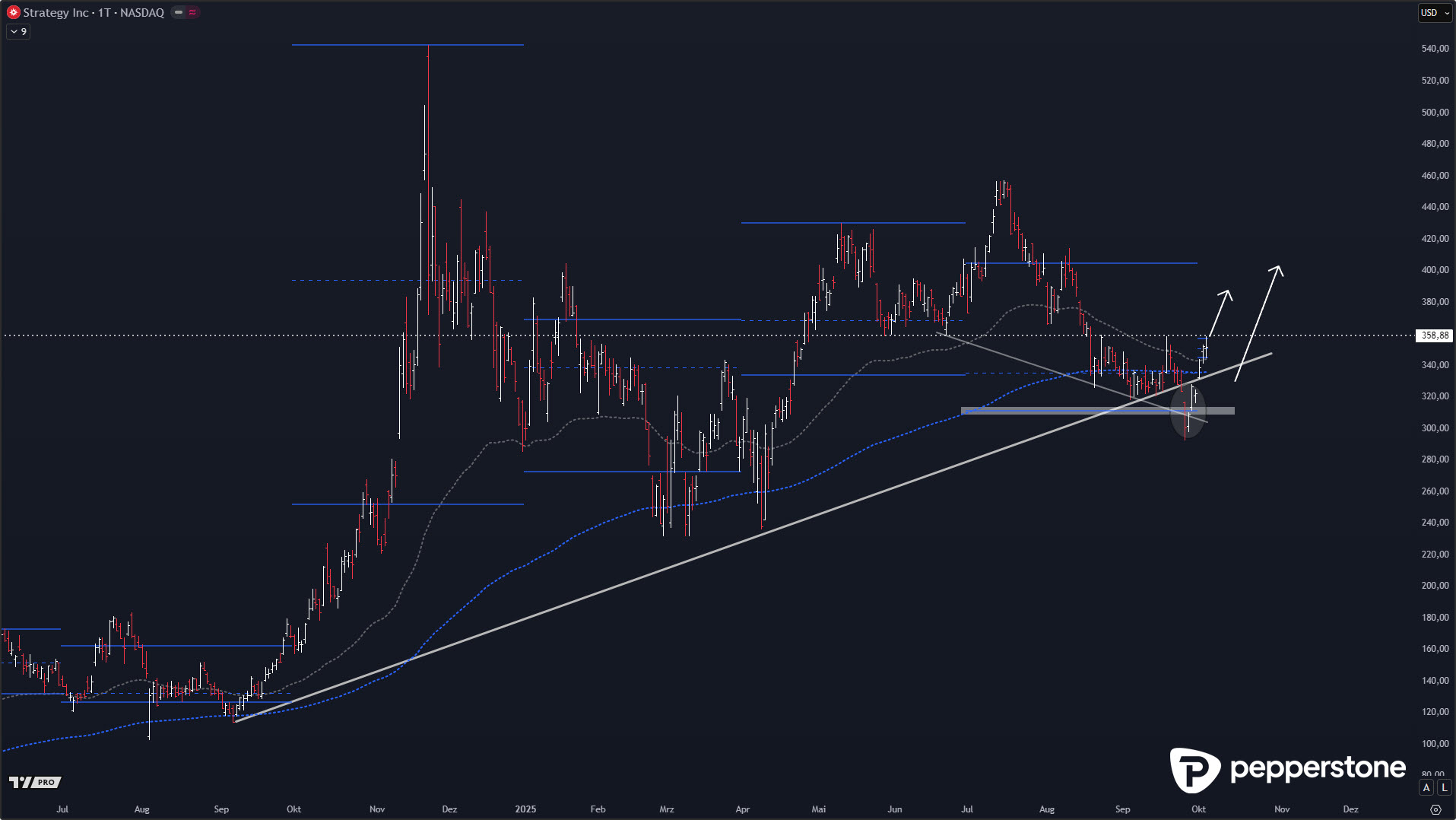 Unterhalb der Value Area Low des aktuellen Jahres haben sich gleich mehrfach Marktteilnehmer verleiten lassen, antizyklisch zu shorten. Zunächst an den Trendlinien, dann am Durchbruch durch eine vermeintliche Unterstützung, und zuletzt an der Value Area Low unter 310 USD. Genau diese Kombination sorgt jetzt für eine potenziell explosive Konstellation, weil die Stops dieser Short-Trades als Liquidität für den nächsten Impuls dienen könnten. Solange Bitcoin und der Kryptomarkt übergeordnet bullisch bleiben, ist jeder dieser Fehltrades Treibstoff für Aufwärtsbewegungen – und das macht MicroStrategy derzeit so attraktiv.