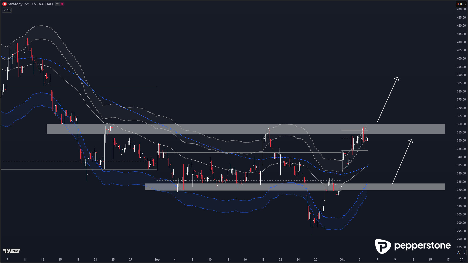 Auf der Oberseite verläuft die zentrale Ausbruchsmarke bei rund 360 USD. Wird sie dynamisch überschritten, entsteht ein technisches Ausbruchssignal mit Zielen bis zur Value Area High bei 404 USD und in der Folge bis zum Hoch bei 460 USD. Scheitert der Ausbruch kurzfristig, bleibt das Rücklaufniveau um 323 USD technisch interessant – dort könnten Käufer erneut aktiv werden. Besonders im Stundenchart wird sichtbar, dass MicroStrategy aktuell zwischen potenzieller Range-Auflösung und trendbestätigender Konsolidierung steht. In beiden Fällen gilt: erst Bestätigung, dann Trade.