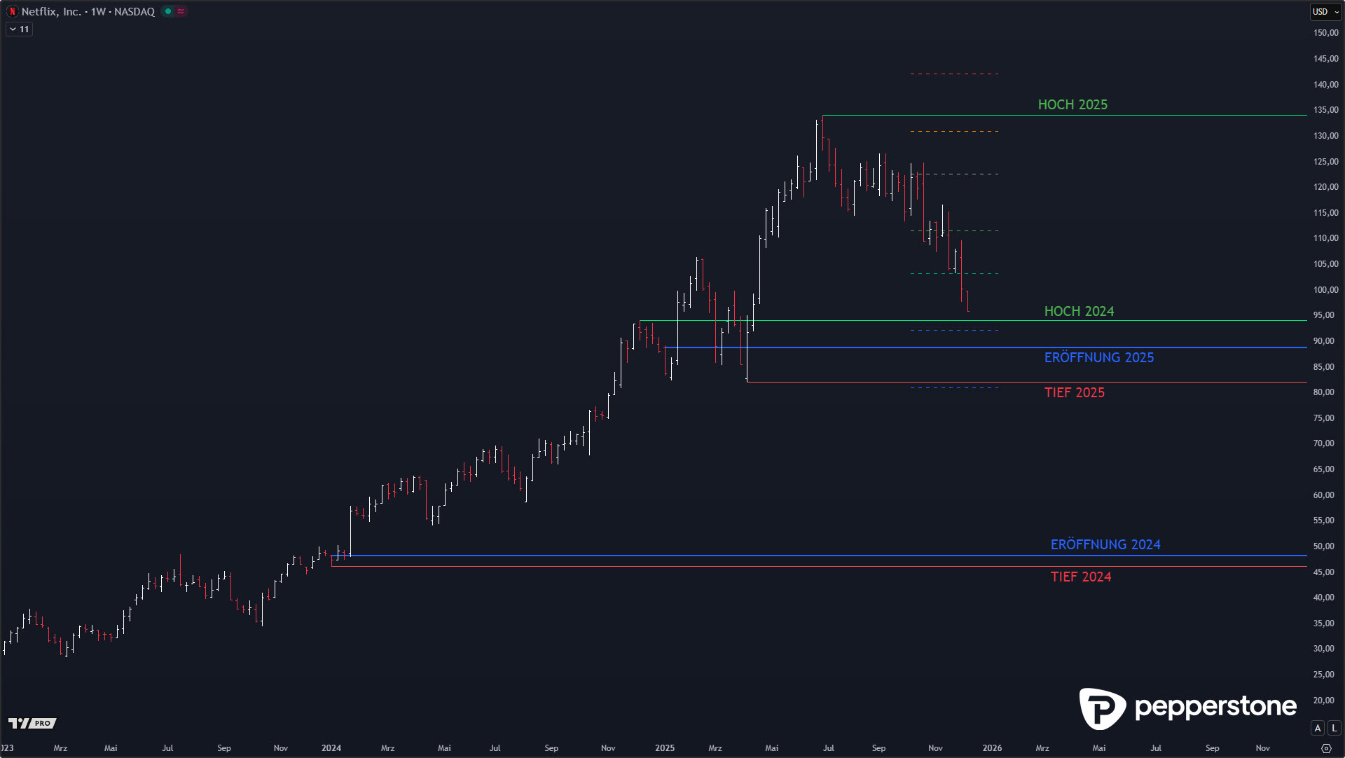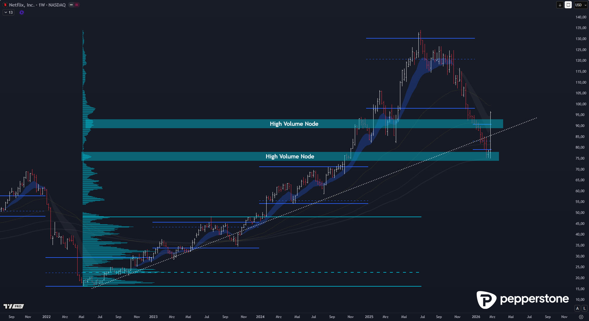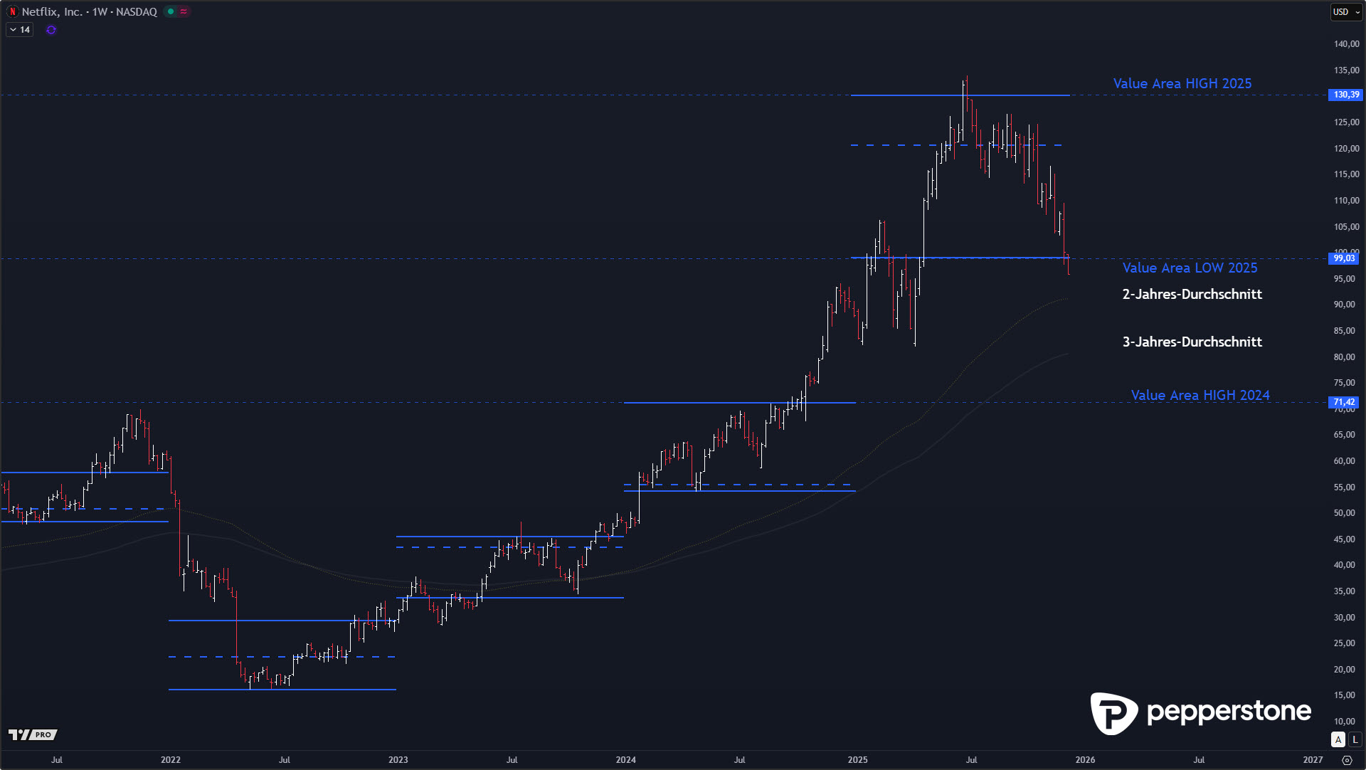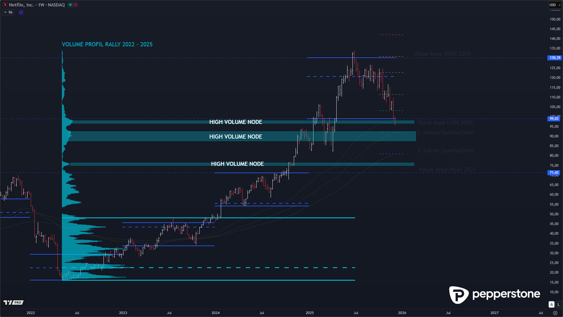 Wie erwartet konnte Netflix nach der Tiefenkorrektur am Ende planbar am 3- bis 4-Jahresdurchschnitt innerhalb des High-Volume-Clusters drehen. Der Punkt war dabei nie, eine „Schwäche“ zu dramatisieren, sondern den Kontext sauber zu halten: Die Jahre 2024 und 2025 waren exzessiv geprägt, die Aktie ist in dieser Phase von 45 auf 135 USD gestiegen. Ein Rücklauf nach so einer Strecke ist kein Crash, sondern eine gesunde, trendtypische Korrektur – solange sie in strukturtragende Zonen hineinläuft und dort Akzeptanz findet.