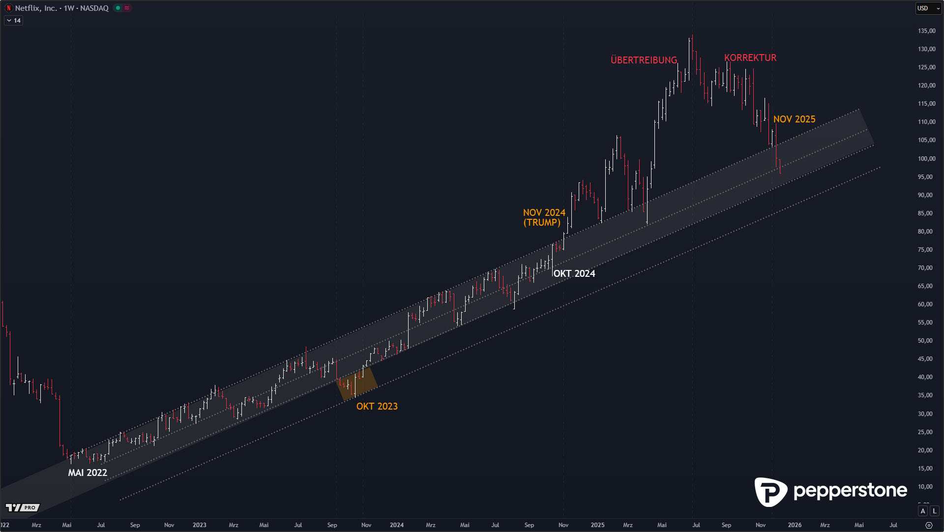 Im Wochenchart zeigt sich ein sauber etablierter Aufwärtstrend, der von Mai 2022 bis Oktober 2024 nahezu lehrbuchhaft verlief. Netflix vollzog in dieser Phase einen kontinuierlichen Trendanstieg, begleitet von einer moderaten Überdehnung auf der Unterseite, die bereits damals als potenzielle Kurszielzone für zukünftige Korrekturen relevant war. Die eigentliche Störstruktur erfolgte jedoch erst mit dem Wahlsieg Donald Trumps, der eine überzogene Rallye bis 134 US-Dollar auslöste – eine typische Trendübertreibung, die sich technisch wie psychologisch klar vom Normalpfad löste und nun schrittweise abgebaut wird. Entscheidend ist dabei, dass die Aktie inzwischen wieder in die Region ihres langjährigen Wachstumstrends zurückkehrt, was Bewertungsniveau und Trenddynamik synchronisiert. Bewegt sich der Kurs weiter Richtung 93 oder sogar 87 US-Dollar, wird Netflix aus dieser langfristigen Perspektive zunehmend preislich attraktiv und nähert sich exakt dem Bereich, in dem die Aktie historisch wiederkehrend Unterstützung fand.