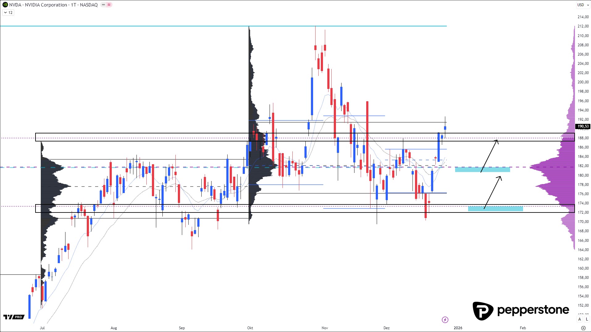 Das Jahr 2025 war bei Nvidia von extremen Bewegungen geprägt. Ein scharfer Abverkauf bis in den Bereich um 96 US-Dollar wurde von einer massiven Gegenbewegung abgelöst, die die Aktie zeitweise über 140 Prozent nach oben trug. Die logische Antwort auf diese Impulsivität ist die seit Juli etablierte Seitwärtsphase. Aktuell pendelt der Markt zwischen rund 170 und 188 US-Dollar, exakt dort, wo das freigeankerte Volumenprofil den fairen Preisbereich definiert. Innerhalb dieser Zone herrscht Akzeptanz, außerhalb davon nimmt die Rücklaufwahrscheinlichkeit deutlich zu.