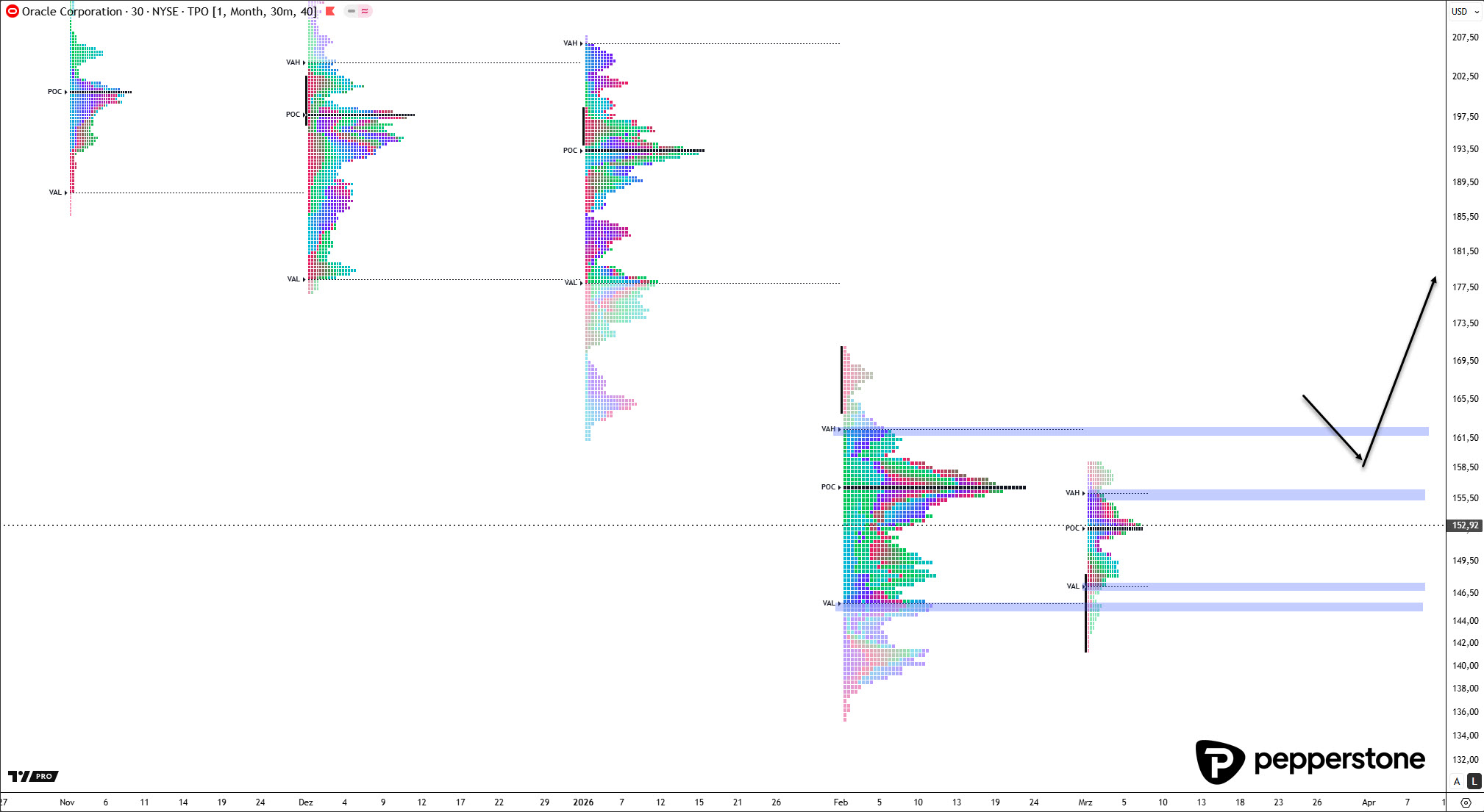 Alternativ kommt es gar nicht zum Stop-Run, sondern Oracle erholt sich direkt: Ein Breakout über die Value Area High Februar (rund 162 USD) und anschließend ein Pullback zurück an diese Zone. Dann wird aus einem ehemaligen Widerstand ein potenzielles Unterstützungsniveau – vorausgesetzt, der Markt akzeptiert den Bereich und fällt nicht sofort wieder darunter. Besonders hilfreich ist hier der TPO (Time Price Opportunity)-Blick: Wenn der Markt in der Spanne zwischen VAH/VAL des Monats oszilliert, ist der Ausbruch plus Pullback oft der sauberere Einstieg als ein „blindes Nachkaufen“ mitten in der Rotation.