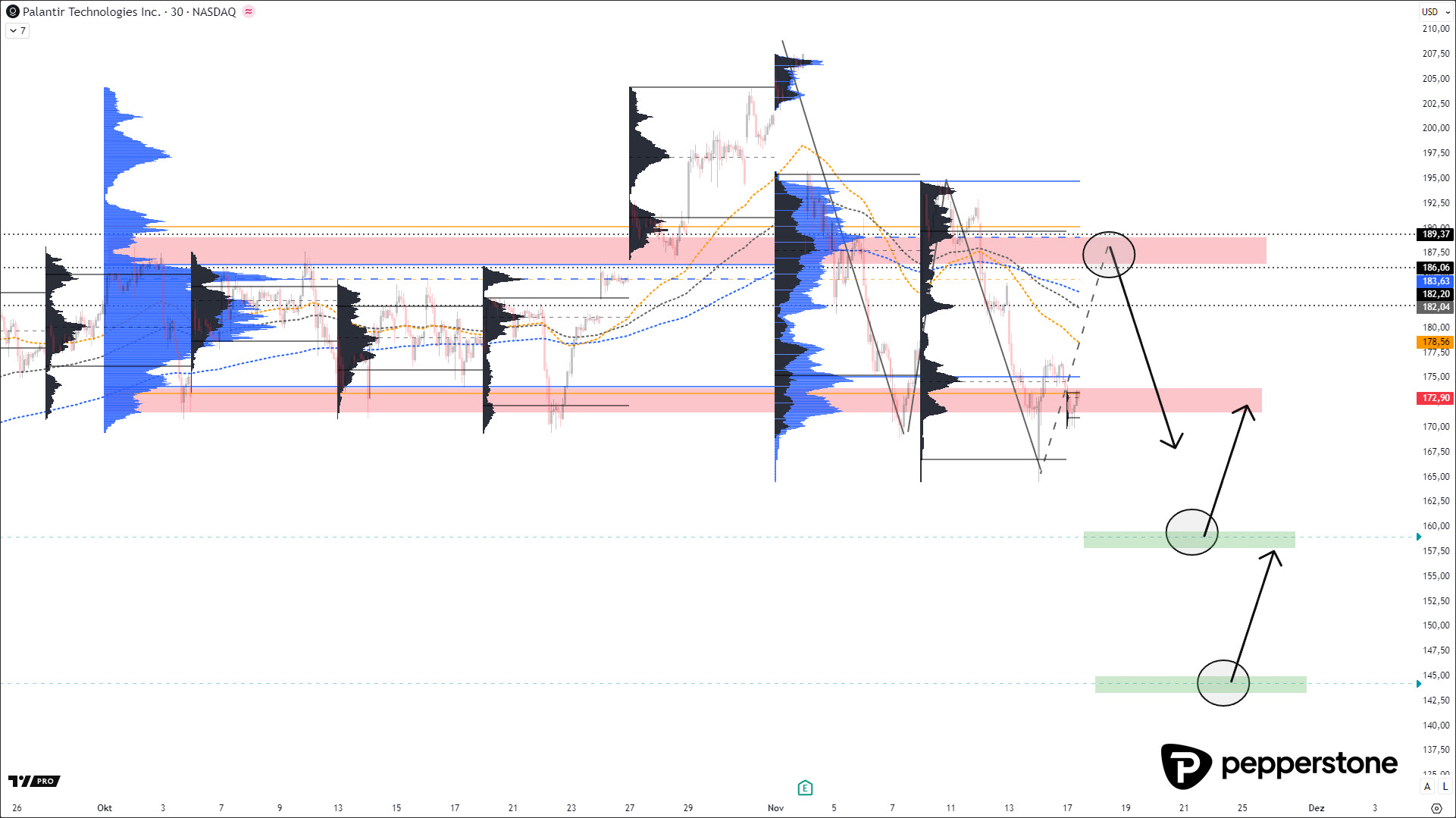 Sollte Palantir eine kurzfristige Erholung einleiten, liegt die strategische Short-Zone zwischen 182 und 186 USD. In diesem Bereich überschneiden sich die obere Grenze der Oktober-Range, die Value Area High sowie mehrere Volumencluster. Kommt es hier zu einer Bestätigung durch Schwächesignale – etwa durch eine Preisabsorption oder eine gescheiterte Breakout-Bewegung –, ergibt sich eine valide Short-Gelegenheit mit Zielrichtung 170–165 USD.