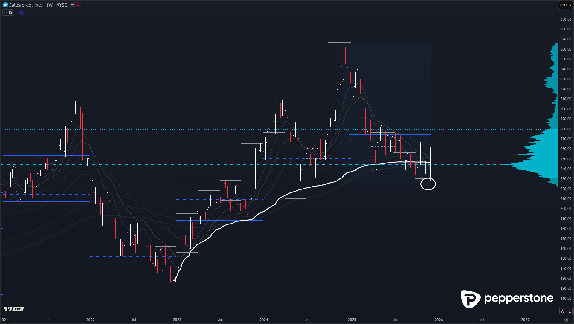 Das Chartbild erinnert klar an die jüngste Entwicklung bei Salesforce (CRM), wo ein kurzer Rutsch unter die Value Area Low einen explosiven Rücklauf in die faire Zone ausgelöst hat. Auch PG zeigt die gleichen Vorbedingungen: überdehnter Rückgang in einen volumenschwachen Bereich, potenzieller Stop-Run unter offensichtliche Tiefs und ein sich verdichtendes institutionelles Unterstützungscluster. Solche Konstellationen sind klassische Reversal-Trigger, die nicht prognostiziert werden, sondern reaktiv gehandelt werden müssen – idealerweise in dem Moment, in dem Preis, Volumenstruktur und Momentum gemeinsam auf ein Ende der Abwärtsphase hinweisen.