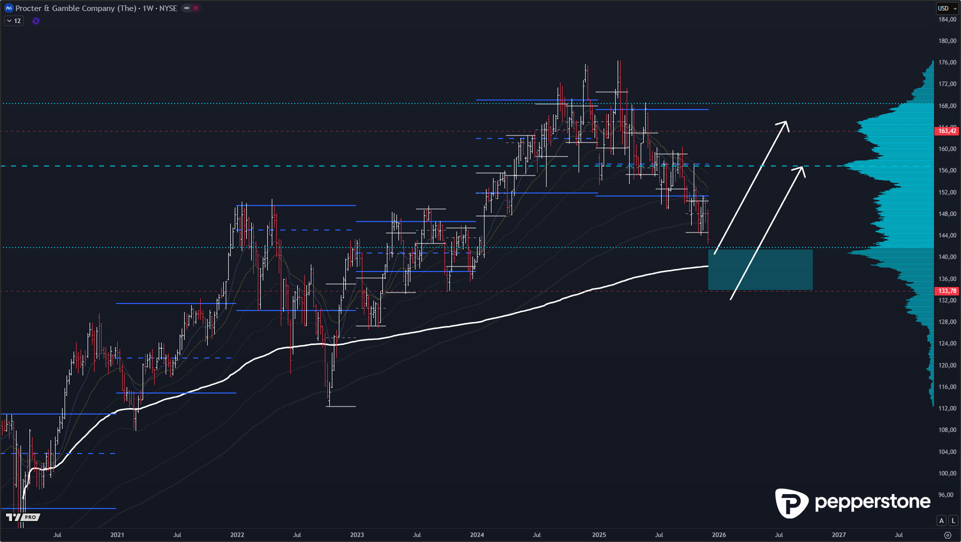 Für Investoren, die sich nicht im Intraday-Kontext bewegen, ist diese Zone ebenfalls essenziell. Unterhalb von 140 USD wird PG zum ersten Mal seit Längerem wieder „unterfair“ gehandelt, was in defensiven Blue Chips selten ist und häufig mit stabilen Bodenbildungsphasen verbunden ist. Entscheidend ist jedoch, nicht blind in fallende Kurse hinein zu kaufen, sondern eine eindeutige Reaktion der Käuferseite abzuwarten. Sobald Preisstabilität und Absorption sichtbar werden, öffnet sich ein attraktives Chance-Risiko-Verhältnis für einen mittelfristigen Swing in Richtung 160+ USD. Damit wird PG zu einem der relevanten Titel für die kommenden Wochen.