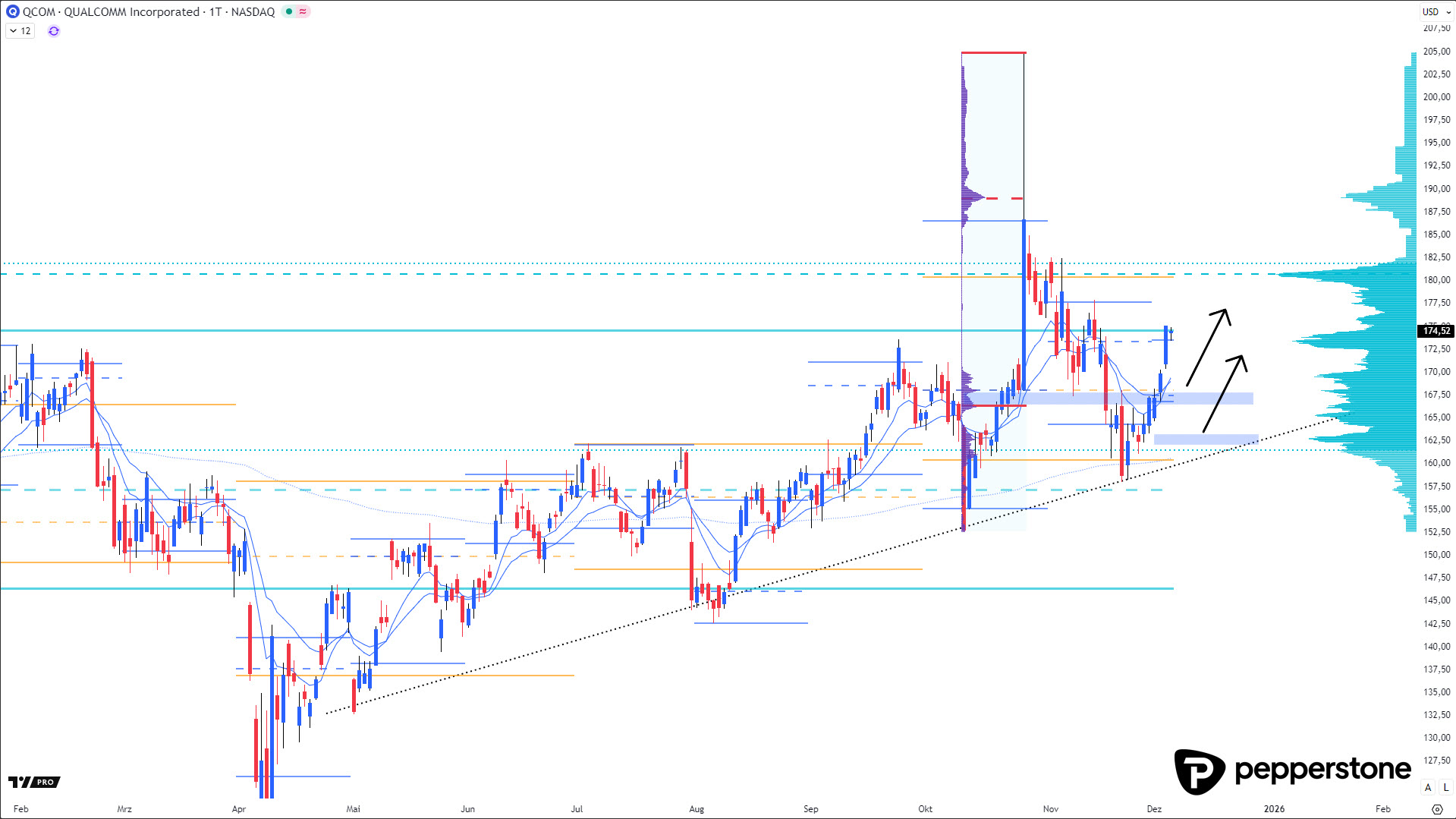 Seit dem politischen Abverkauf im April – ausgelöst durch die damaligen Zollthemen – hat sich die Aktie beeindruckend stabilisiert und einen klaren Aufwärtstrend aufgebaut, der sich in einer rhythmischen Sequenz aus steigenden Hochs und höheren Tiefs zeigt. Dieses Muster deutet seit Monaten darauf hin, dass institutionelle Käufer Rücksetzer konsequent nutzen und den Trend strukturell tragen. Zwar kam es zuletzt zu einer Überdehnung auf der Oberseite, doch grundsätzlich bleibt die Ordnung des Marktes intakt. Qualcomm befindet sich damit in einem Umfeld, in dem prozyklisches Nachlaufen weniger sinnvoll ist, während Rücksetzer in faire Preiszonen hohes Potenzial eröffnen.