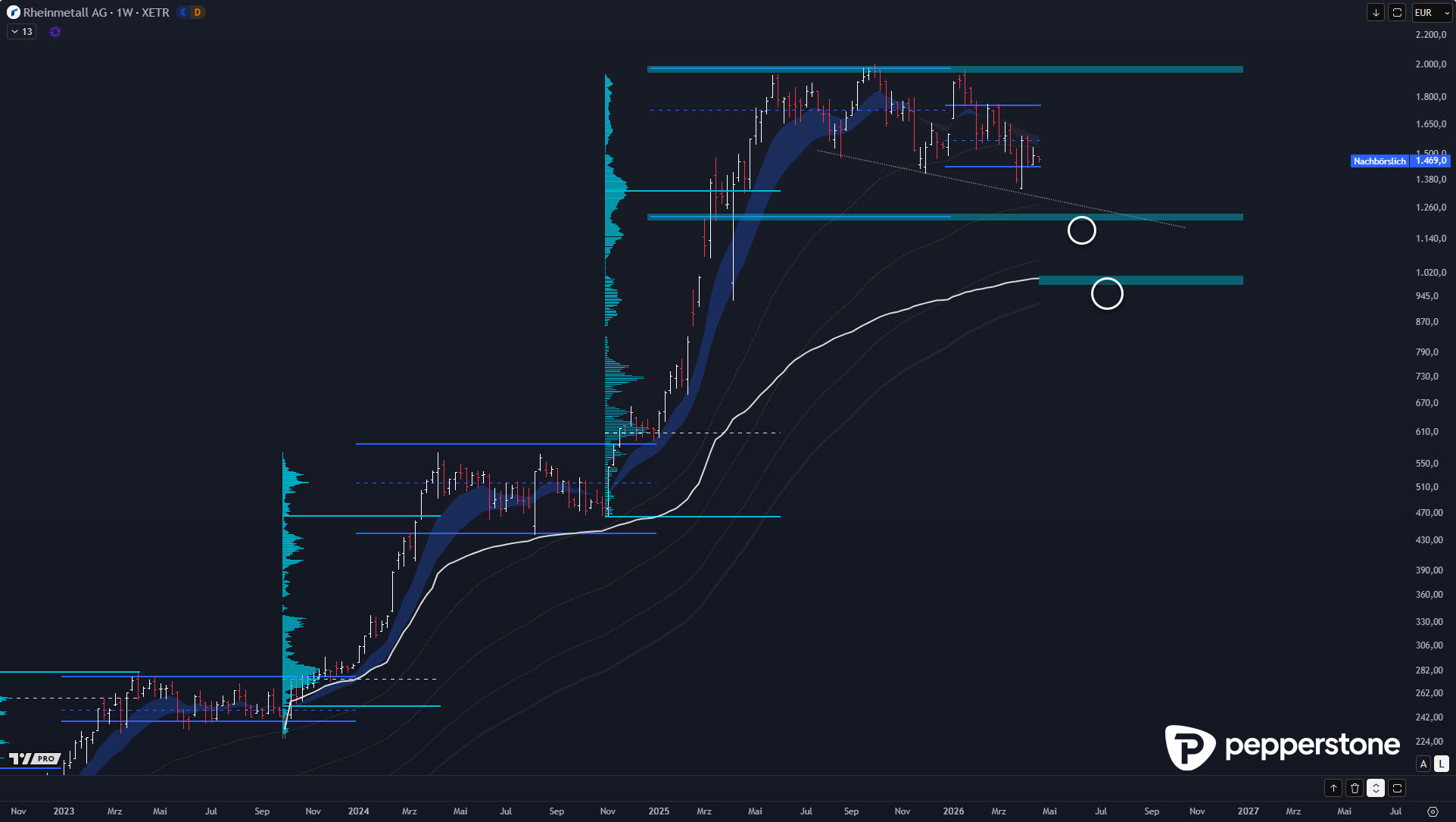 Die zweite relevante Marke ist ein volumengewichteter Durchschnitt, geankert am Beginn der Oktoberrally 2023, im Bereich um ~1.010 EUR. Das ist ein tieferes, schwereres Level – und damit eine Zone, die als „Minimum an Korrektur“ plausibel wird, wenn der Markt die Bereinigung ausweitet. Auch hier gilt: Das ist kein Forecast, sondern ein Plan. Sollte Rheinmetall dorthin laufen, ist der Fokus wieder identisch: Zeigt der Markt dort Absorption und eine klare Reaktionsstruktur, kann ein kurzfristiger Rebound-Trade sauber werden. Ohne Bestätigung bleibt es nur eine Marke.