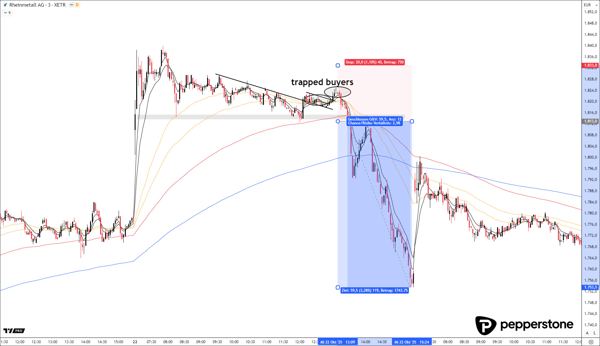 Exakt dieses Spielbild hat sich nun entfaltet: Der Markt erreichte die Zone, bestätigte Schwäche über die kleinen Zeiteinheiten und generierte eine neue Abwärtsdynamik. Damit reiht sich Rheinmetall in die Serie taktischer Beispiele ein, wie sie zuletzt auch bei Walmart oder McDonald’s zu beobachten waren – technische Bestätigung, dynamischer Folgeschub und klare Abgrenzung des Risikos. Dieses Zusammenspiel zeigt erneut, dass die Qualität des Setups wichtiger ist als die Richtung selbst.