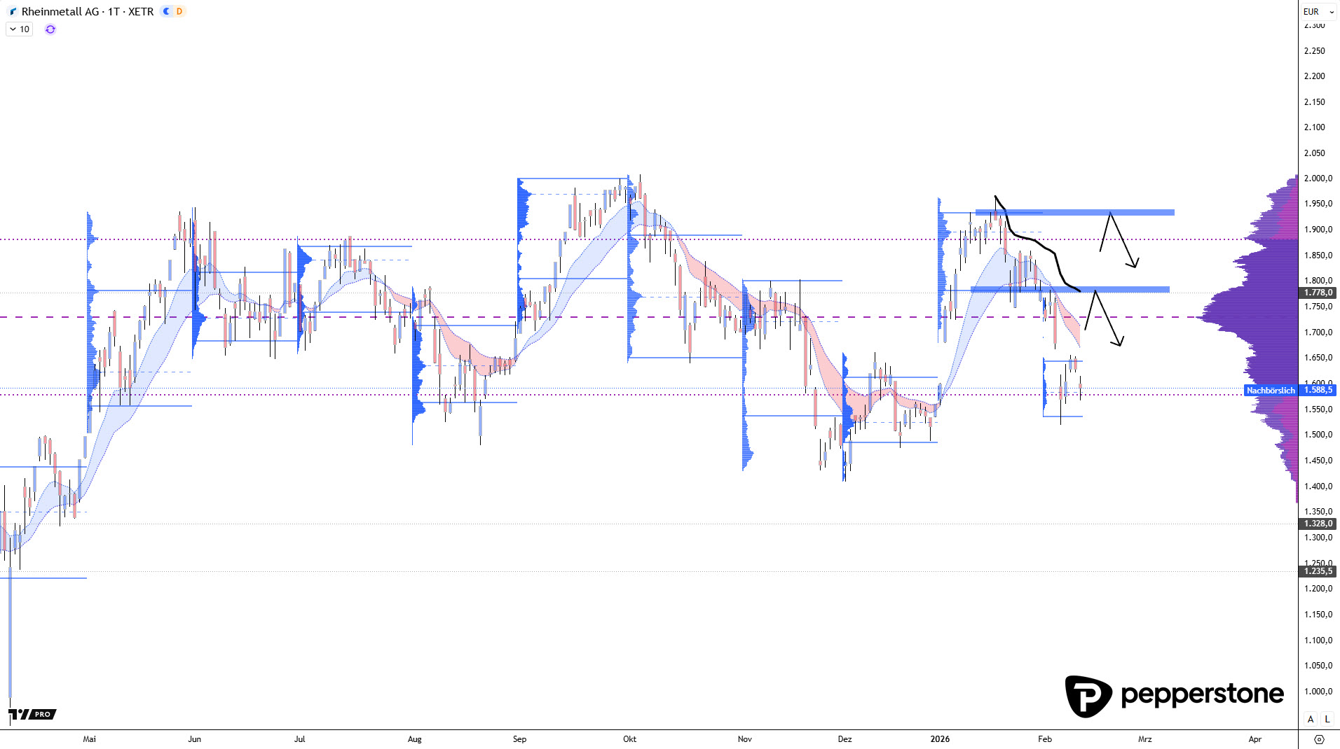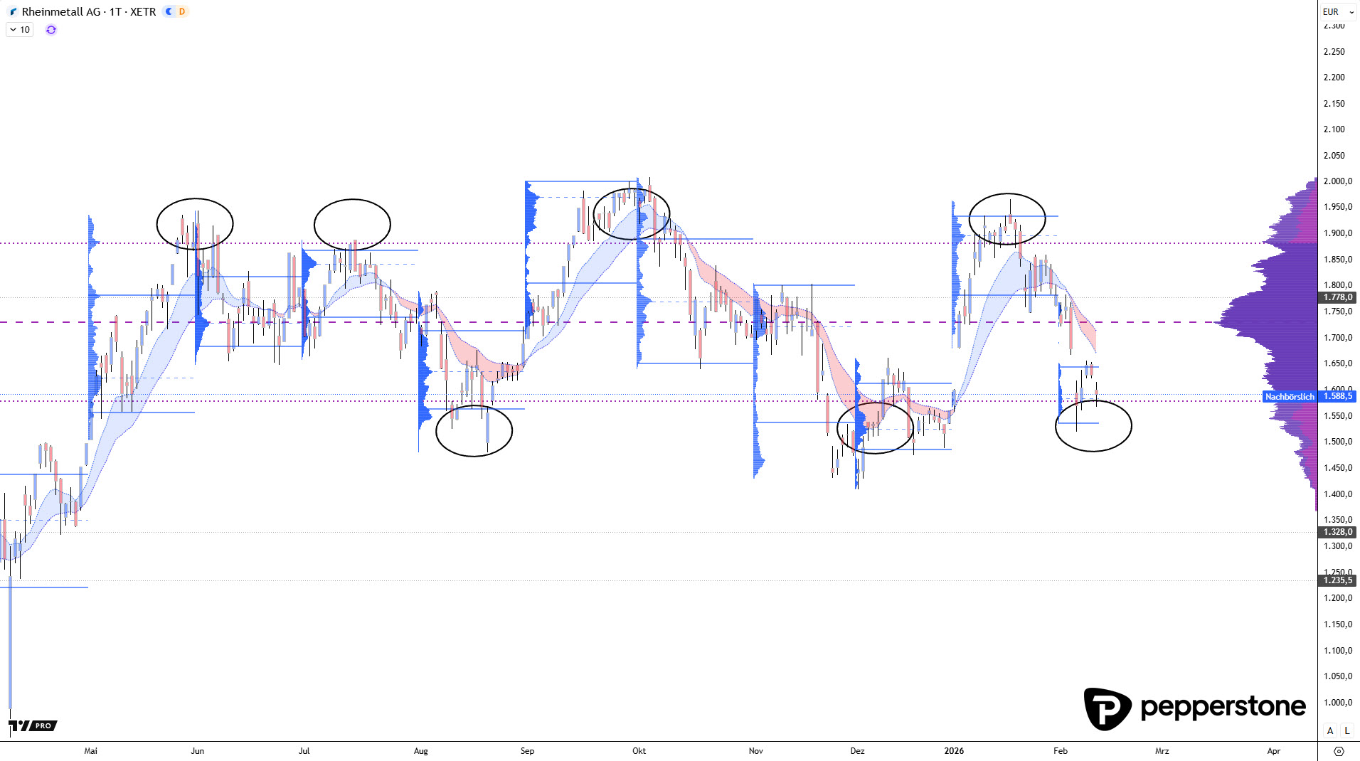 Ein weiterer, oft unterschätzter Punkt ist das Timing. Das Setup lebt davon, dass der Markt die Value-Kanten mit Überdehnung anläuft – schnell, impulsiv, mit vielen Marktteilnehmern auf dem falschen Fuß. Wenn Rheinmetall dagegen langsam konsolidiert, „sauber“ an ein Level heranarbeitet und sich der Markt an die Zone gewöhnt, verliert das Ganze seinen Edge. Ich ordne das als saubere Bedingung ein: Nicht das Level allein ist das Setup, sondern die Kombination aus Level plus Geschwindigkeit plus Reaktion. Ohne diese Zutaten ist es am Ende nur ein hübsch eingezeichneter Bereich ohne statistischen Vorteil.