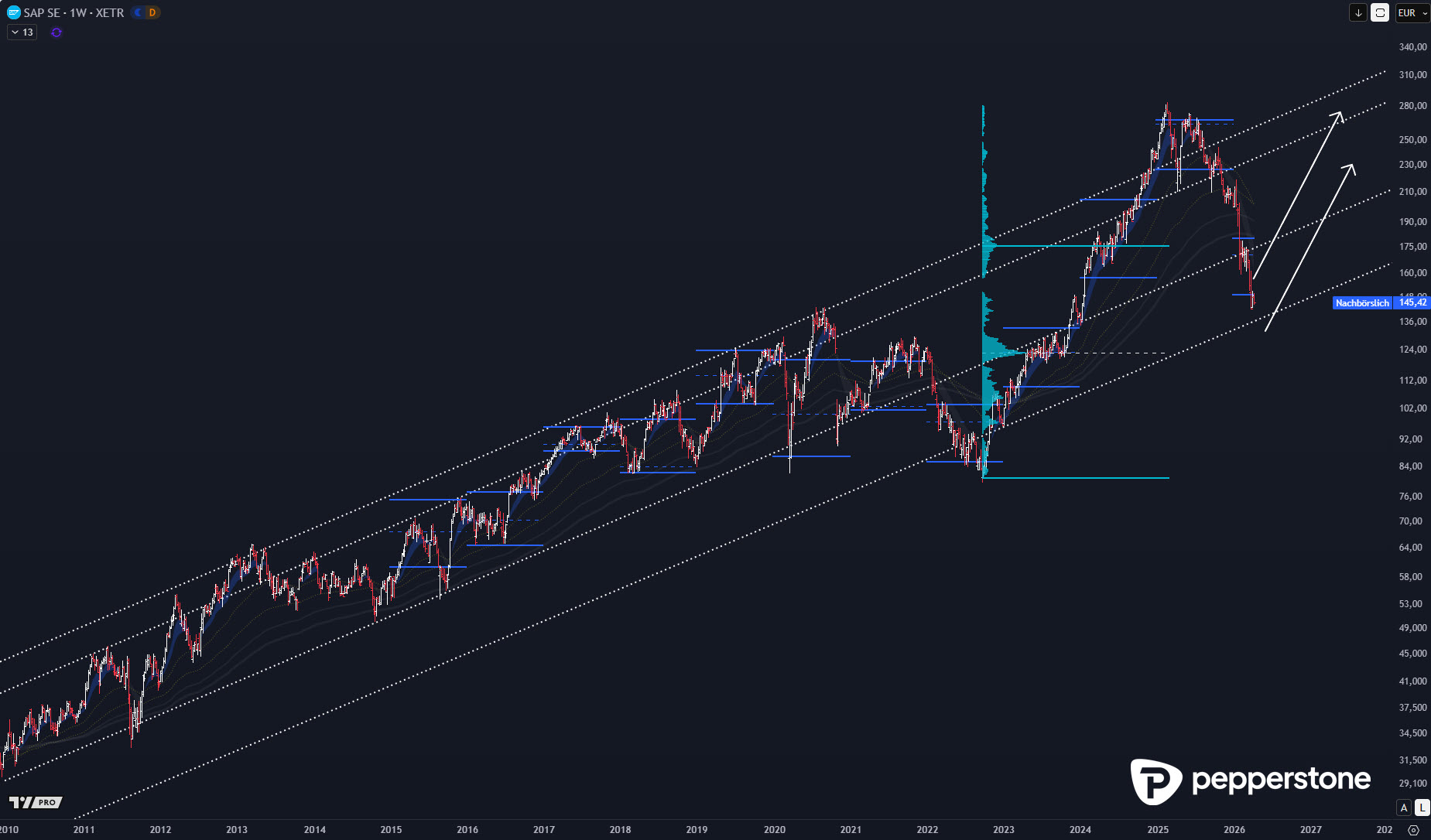SAP bleibt in der großen Perspektive sehr bullisch: Seit 2009 läuft ein stabiler Trendkanal, der über Jahre hinweg immer wieder Überdehnung und Entlastung produziert. Nach einem starken Impuls ist eine Korrektur nicht nur normal, sondern notwendig, um später wieder einen sauberen Trendfortsatz zu ermöglichen. Selbst wenn kurzfristig noch kein neuer Impuls entsteht, bleibt das Bild konstruktiv, solange die Korrektur geordnet bleibt und nicht in echte Strukturbrüche kippt. Meiner Meinung nach ist SAP damit weiterhin ein „Buy-the-dip“-Kandidat – aber auch hier gilt: erst wenn der Rücklauf in sinnvolle Zonen führt.