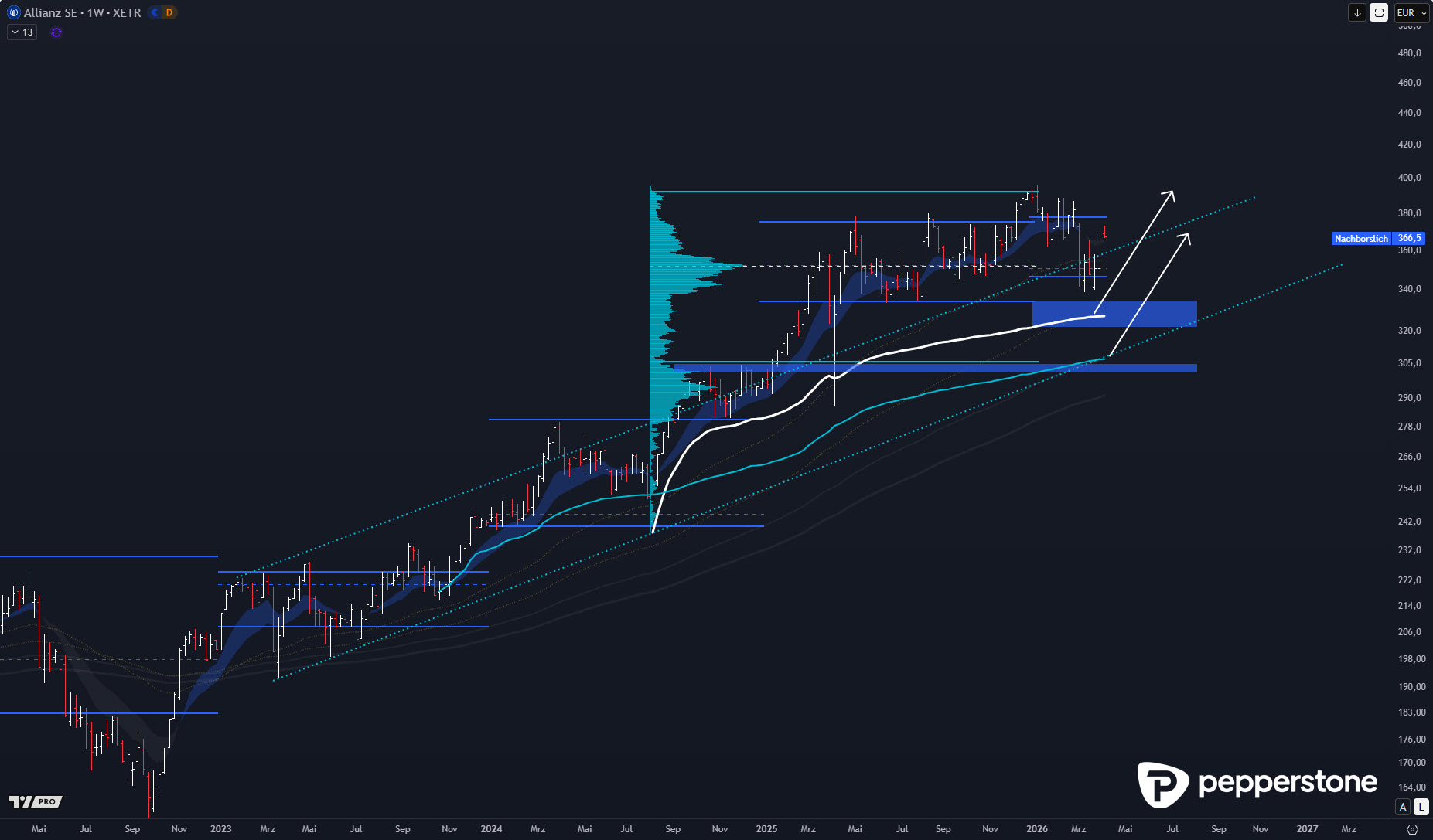 Allianz pendelt weiterhin in der Vorjahres-Value, grob 375 € auf der Oberseite und 330 € auf der Unterseite, bei einem seit 2023 stabilen Aufwärtstrend. An der Struktur ist wenig zu rütteln, aber preislich ist das Setup aktuell unattraktiv: Ein möglicher Fehlausbruch auf der Oberseite und die Absorption an der Value Area High sprechen eher dafür, dass günstigere Kurse erst noch erarbeitet werden müssen. Meiner Meinung nach ist hier Geduld die eigentliche Strategie – nicht, weil Allianz „schlecht“ wäre, sondern weil die besten Trades meist unten entstehen.