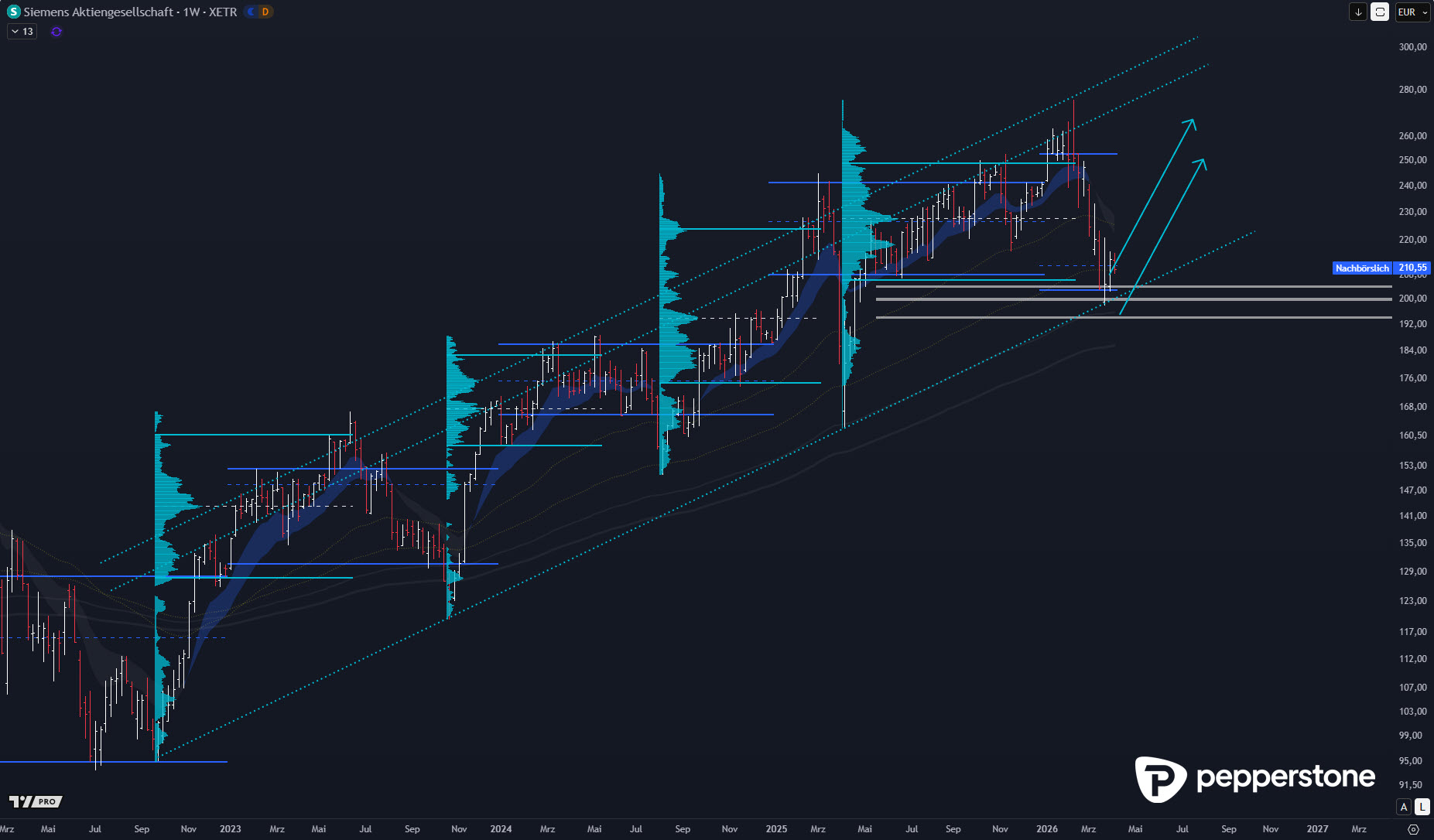 Trotz des Anstiegs bleibt die übergeordnete Struktur konstruktiv, selbst wenn es noch einmal zu einem Rücksetzer kommt. Solange zentrale Referenzen nicht klar verletzt werden, ist die Korrektur eher trendfortsetzend zu interpretieren als trendbrechend. Der Kern ist die Marktlogik: Ein sauberer Aufwärtstrend „atmet“, und der Rücklauf ist häufig die Phase, in der der nächste Impuls vorbereitet wird. So ordne ich das aktuell ein: Siemens bleibt ein Trendtitel, bei dem Rückläufe interessanter sind als Ausbrüche.