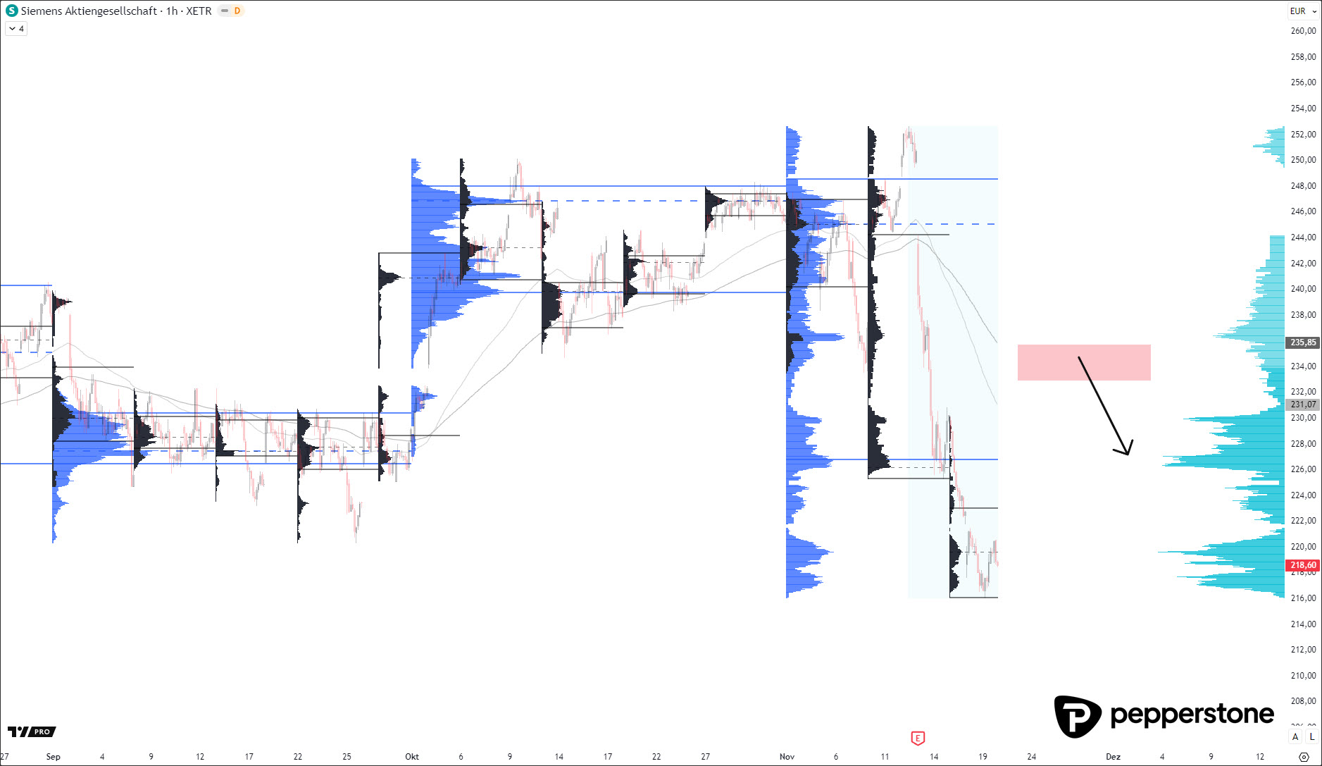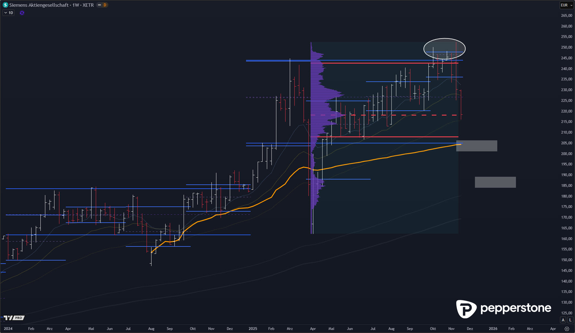 Siemens hat mehrere deutliche Warnsignale geliefert. Die doppelte Absorption, der Verlust der Value Area High und der impulsive Rücksetzer von über 14 % sprechen klar gegen einen stabilen Markt.