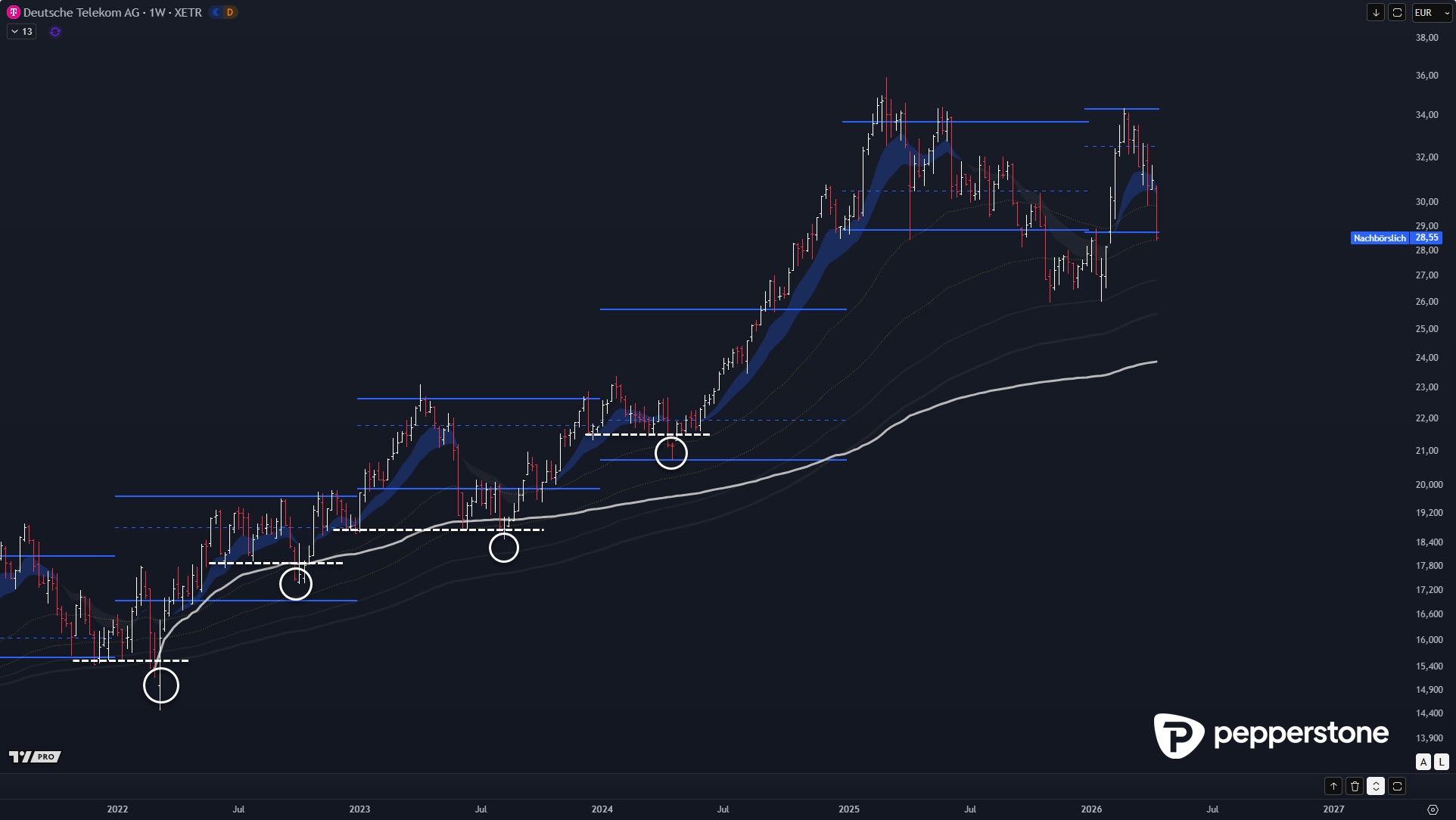 Bei der Deutschen Telekom liegt der Markt aktuell im fairen Preisbereich des Vorjahres, grob zwischen 29 € (VAL) und 34 € (VAH). Diese Value-Range ist entscheidend, weil sie erklärt, warum der Kurs an den Rändern häufig antizyklisch reagiert: Oberhalb der Value fehlt Akzeptanz, unterhalb der Value entsteht oft der Bereich, in dem wieder gesammelt wird. Nach den starken Anstiegen 2024–2025 ist es daher nicht ungewöhnlich, dass die Aktie zunächst rotiert statt „mit dem Markt zu laufen“. Genau diese Ruhephase ist häufig der Vorlauf für das nächste saubere Setup.