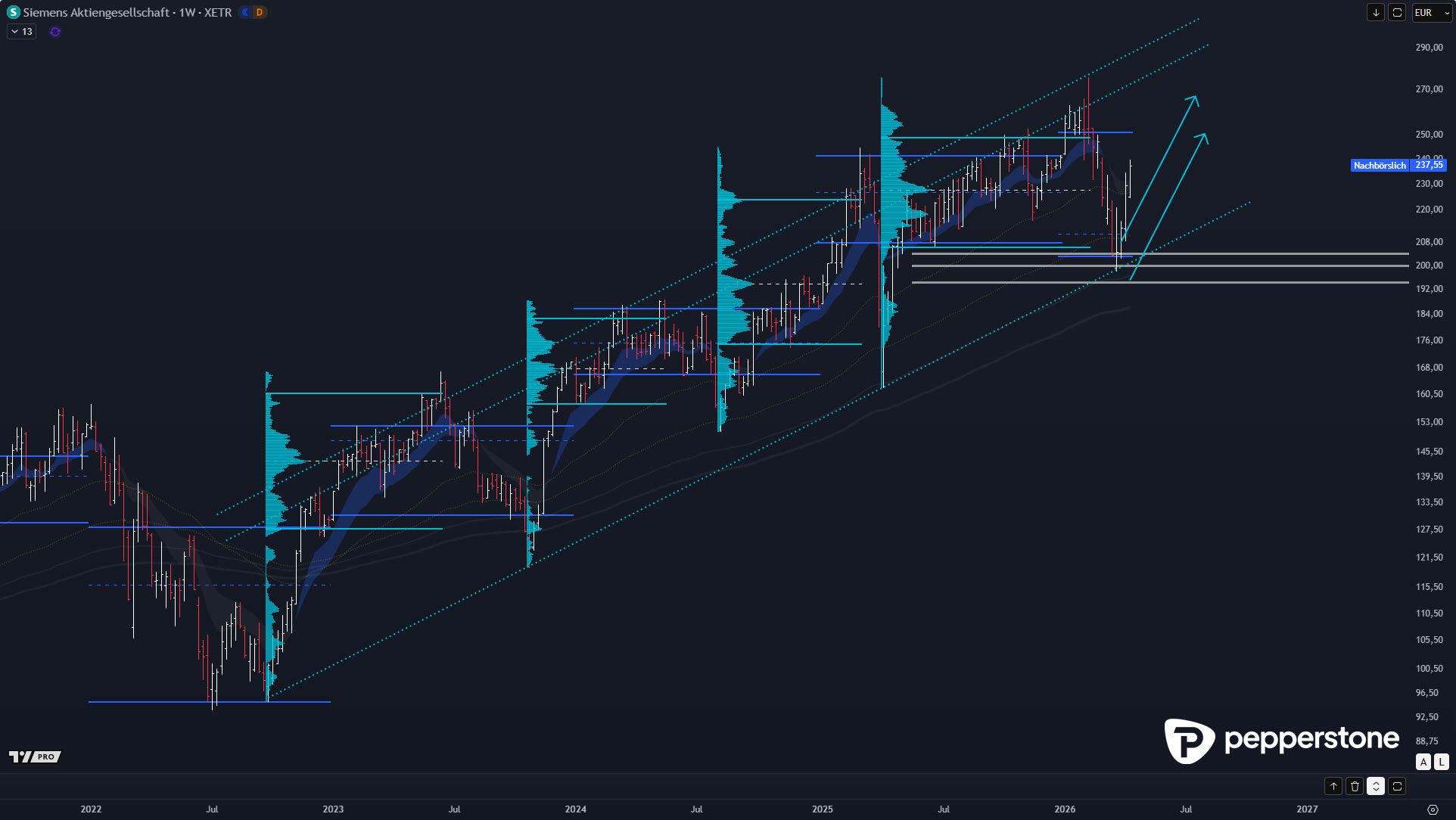 Siemens hat genau das Muster gezeigt, das ich in Trendtiteln bevorzuge: Rücklauf unter die Value Area Low des Vorjahres, hier rund 208 €, und danach eine schnelle, impulsive Reaktion. Solche Bewegungen wirken im Nachhinein „offensichtlich“, werden aber live oft übersehen, weil sie in Momenten entstehen, in denen das mediale Interesse bereits weitergezogen ist. Der technische Kern bleibt simpel: Unter Value entsteht die Übertreibung, und wenn diese Übertreibung absorbiert wird, ist der nächste Trendimpuls oft nur eine Frage der Zeit – nicht der Story.