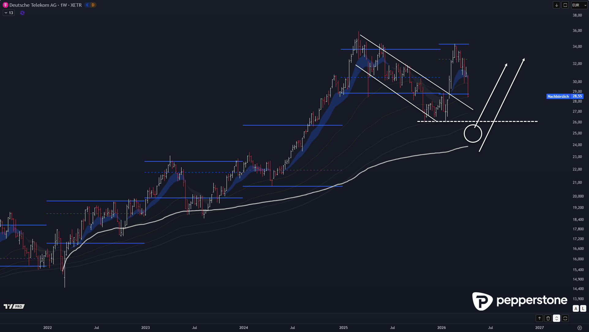 Die Deutsche Telekom wirkt in dieser Phase eher vorsichtig zu behandeln, weil nach starken Anstiegen eine breitere Korrektur völlig normal ist. Der entscheidende Punkt ist die Blickrichtung: Ein möglicher Stop-Run ist kein Short-Call, sondern die potenzielle Eintrittskarte für ein Long-Setup mit besserem CRV. Wer strukturiert arbeitet, wartet auf den Liquiditätsschub unter Tiefs, beobachtet die Reaktion und handelt erst bei Bestätigung. So ordne ich das aktuell ein: Siemens hat das Muster bereits geliefert – Telekom könnte es vorbereiten, wenn der Markt die nötige Übertreibung zulässt.