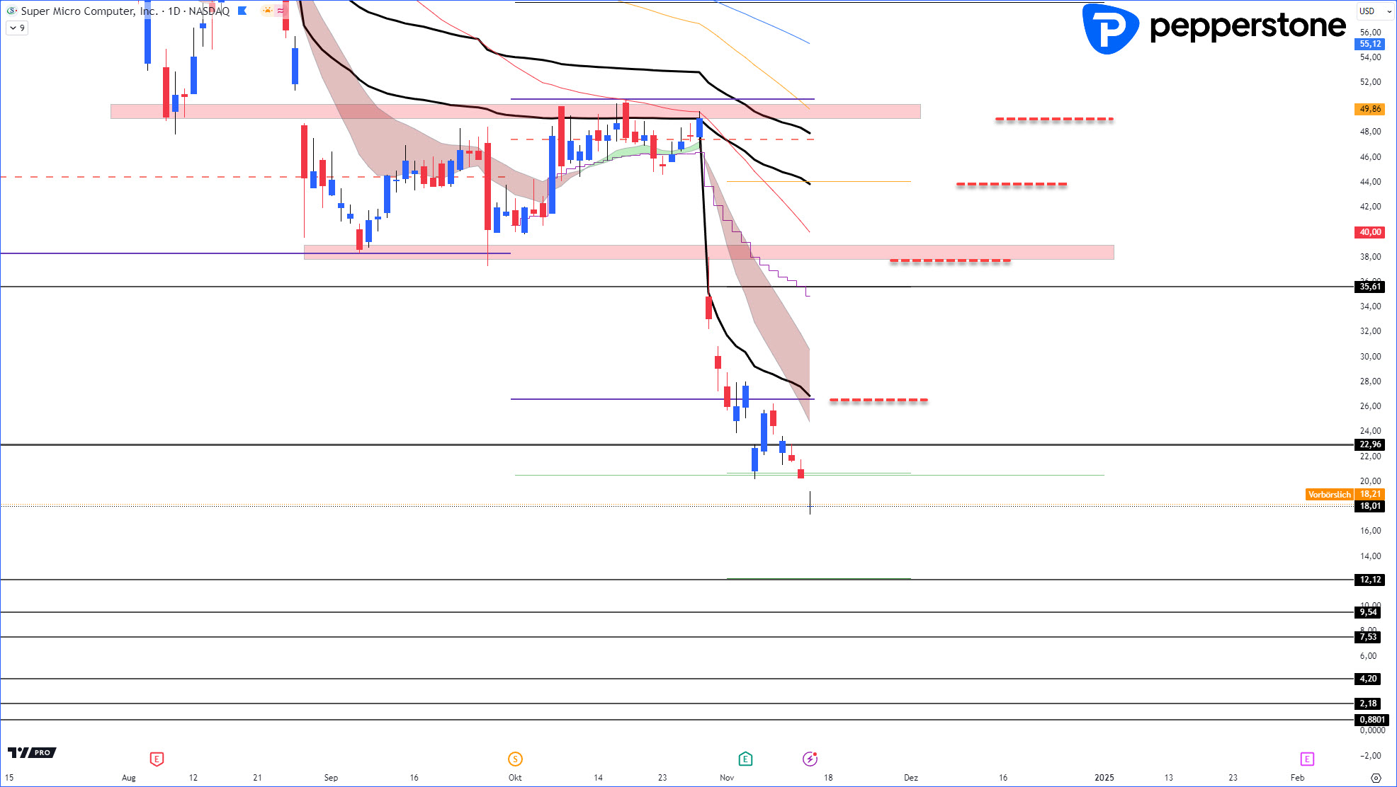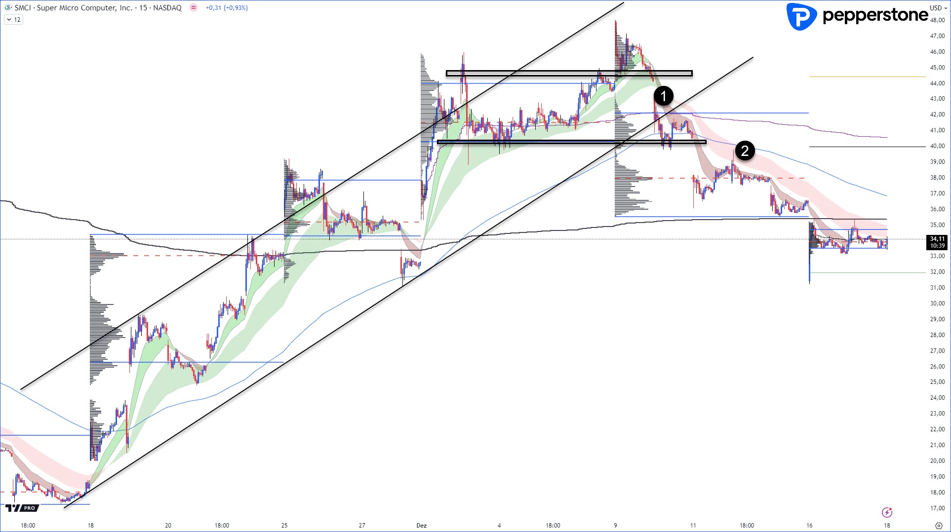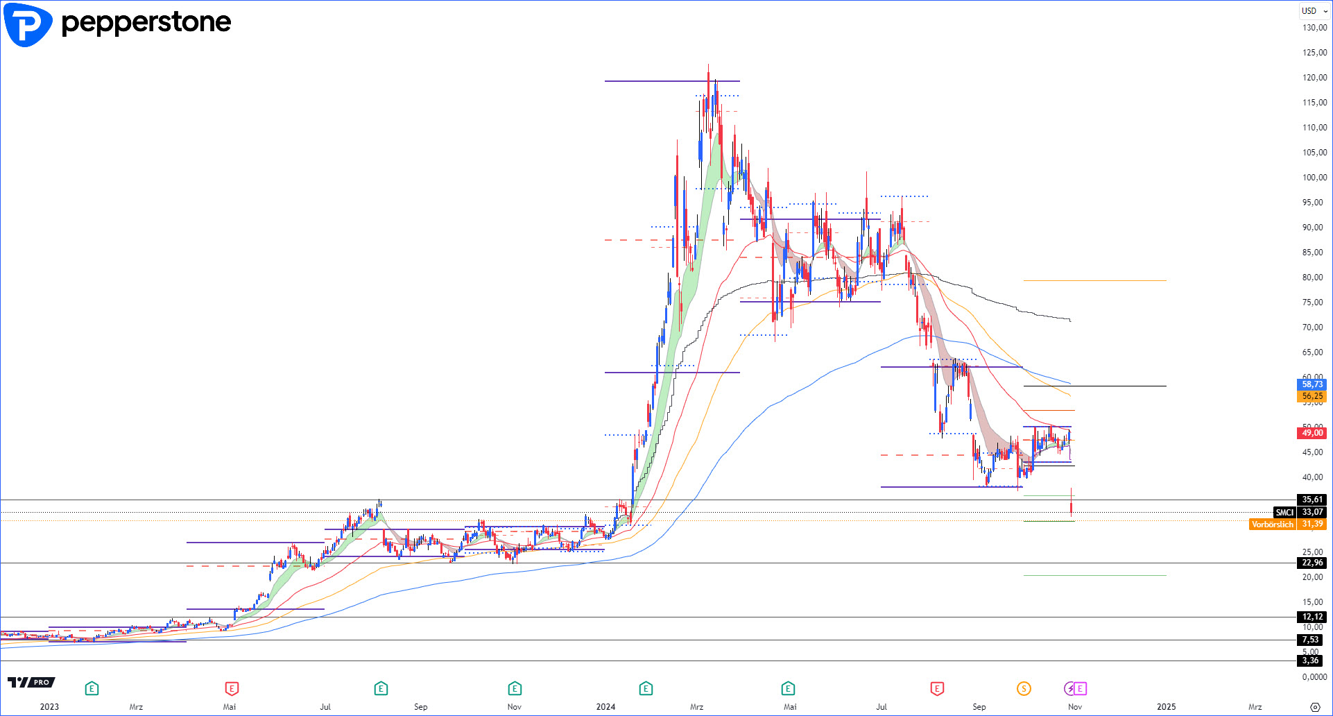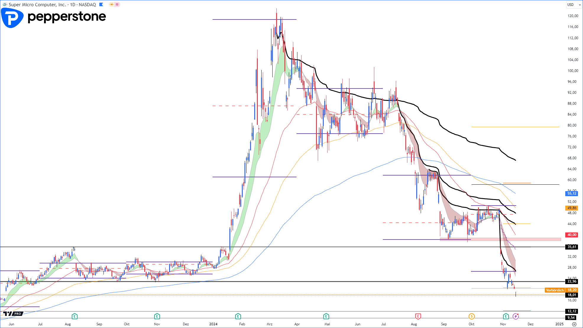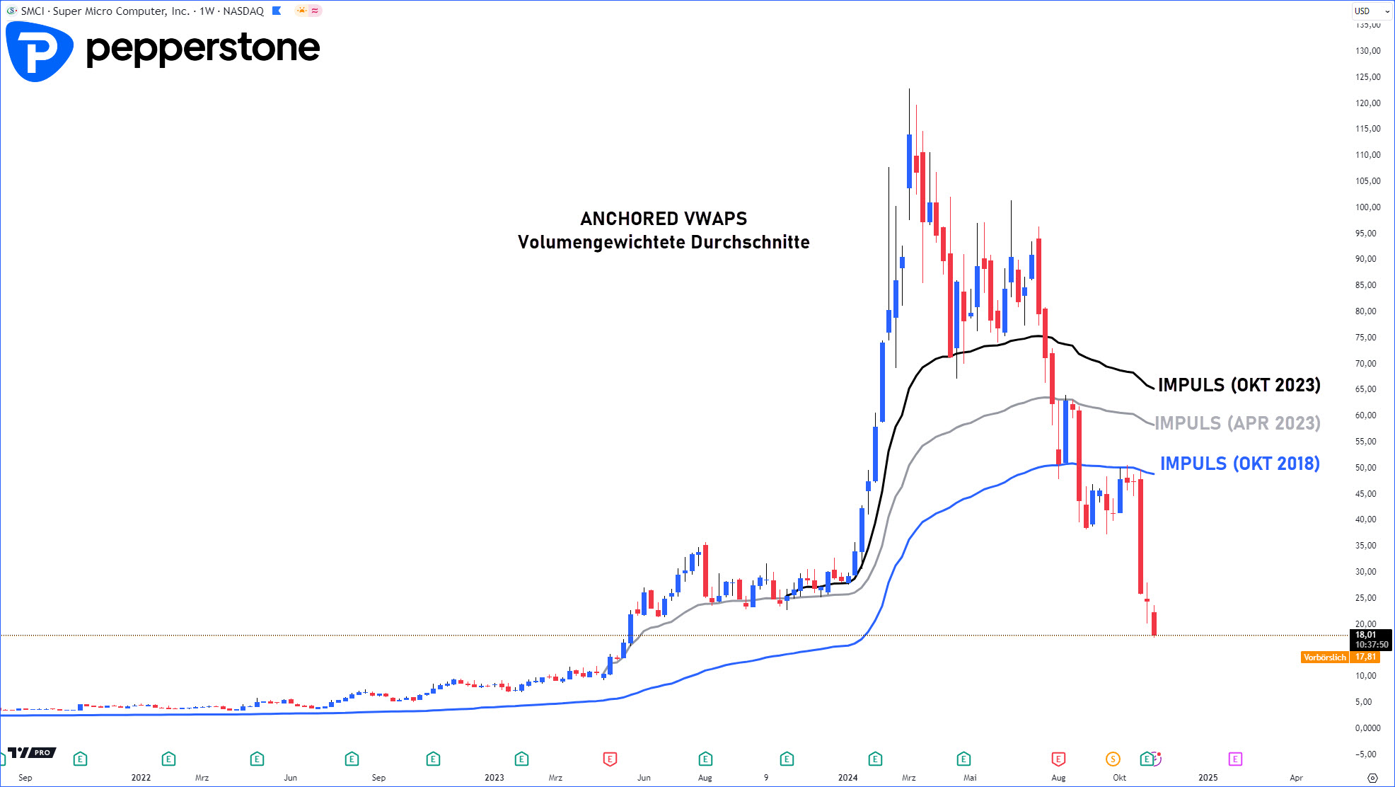 Solange die Kurse über den wichtigen volumengewichteten Durchschnitten laufen und bullisch daran abprallen, ist eine Rally intakt. Im Fall von SMCI wurden alle relevanten AVWAPS gebrochen. Vorsichtige Marktteilnehmer haben hier die Kursreaktionen (Berührung und temporärer Abpraller) genutzt, um sich aus ihren Long-Positionen zu verabschieden.