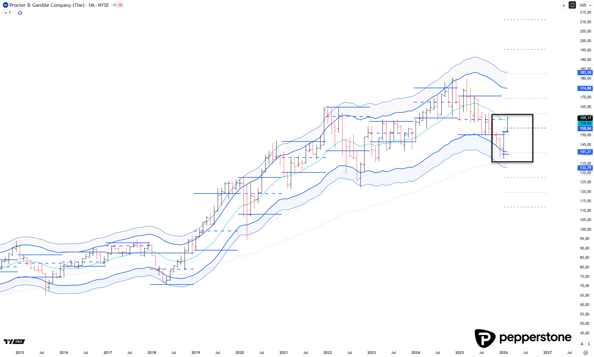 Marken wie Pampers, Gillette oder Ariel sind fest im Alltag verankert und sorgen dafür, dass der Konzern auch in wirtschaftlich schwächeren Phasen stabile Umsätze generiert. Genau diese „langweilige“ Berechenbarkeit macht Procter & Gamble aus Anlegersicht so interessant, insbesondere dann, wenn der Gesamtmarkt zunehmend Überdehnungserscheinungen zeigt und Kapitalrotationen wahrscheinlicher werden.
