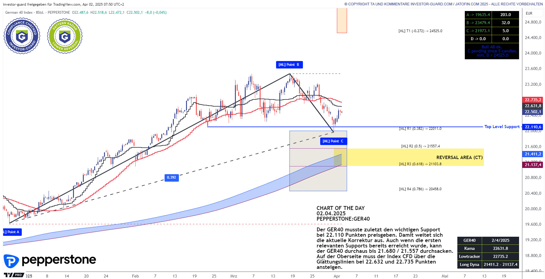 Im Chart of the Day prüfen wir heute den DAX (PEPPERSTONE:GER40). Der GER40 musste zuletzt den wichtigen Support bei 22.110 Punkten preisgeben. Damit weitet sich die aktuelle Korrektur aus. Auch wenn die ersten relevanten Supports bereits erreicht wurde, kann der GER40 durchaus bis 21.680 / 21.557✅ durchsacken. Auf der Oberseite muss der Index CFD über die Glättungslinien bei 22.632 und 22.735❌ Punkten ansteigen. Suchen Sie nach klaren und belastbaren Setups und setzen Sie ein konsequentes Risikomanagement um, das Ihr Konto nicht gefährdet.