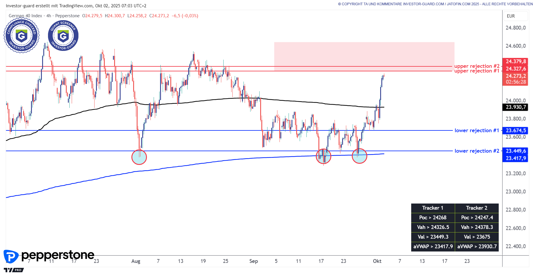 Am ersten Handelstag im Oktober zeigte der DAX eine starke Performance und schloss mit einem deutlichen Plus von 0,98 Prozent bei 24.113,62 Punkten. Der Index startete zunächst schwächer, konnte sich aber im Handelsverlauf erholen und sogar die 24.000er-Marke überwinden. Auch der TecDAX legte zu und beendete die Sitzung 0,71 Prozent höher bei 3.674,31 Punkten. Der kurzzeitige Einfluss des US-Shutdowns auf den deutschen Markt war begrenzt, dennoch stieg die Unsicherheit wegen fehlender US-Arbeitsmarktdaten und Erwartungen an mögliche Zinssenkungen – was zu erhöhter Volatilität führen kann.