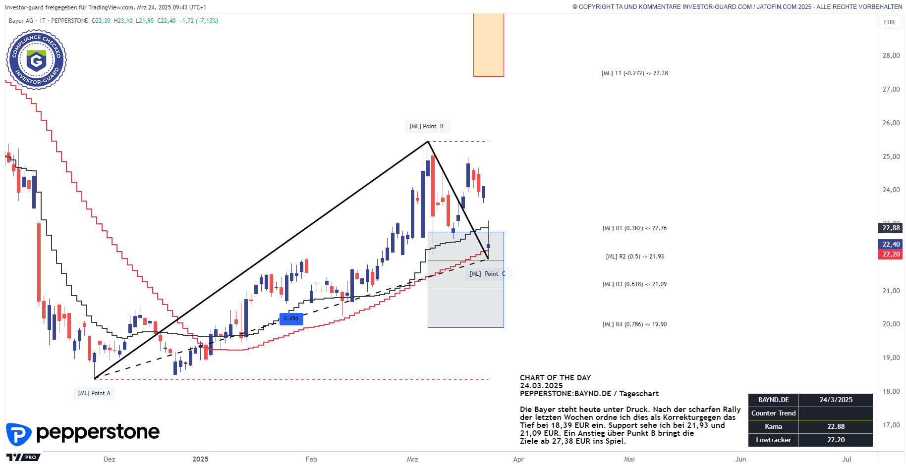 Im Chart of the Day prüfen wir heute Bayer AG (BAYND.DE). Die Bayer (CFD) steht heute unter Druck. Nach der scharfen Rally der letzten Wochen ordne ich dies als Korrekturgegen das Tief bei 18,39 EUR ein. Support sehe ich bei 21,93 und 21,09 EUR✔️. Ein Anstieg über Punkt B bringt die Ziele ab 27,38 EUR❌ ins Spiel. Suchen Sie nach klaren und belastbaren Setups.