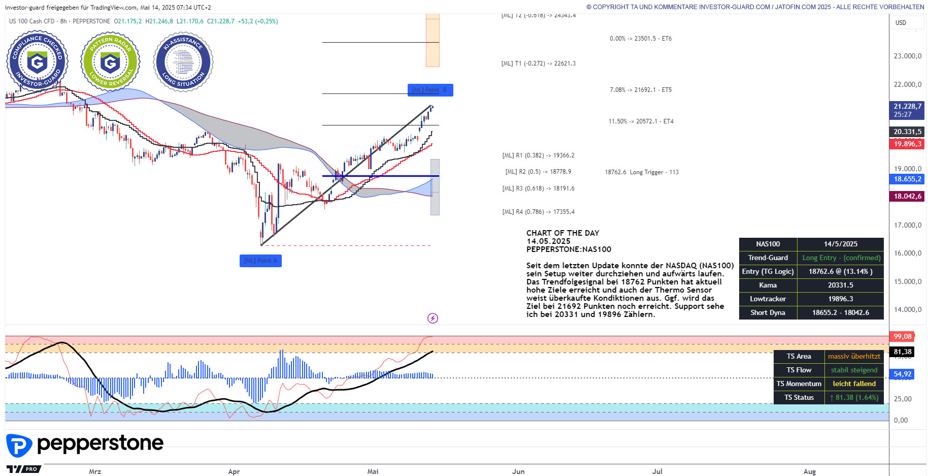 Im Chart of the Day prüfen wir heute wir heute den Nasdaq100 (PEPPERSTONE:NAS100). Seit dem letzten Update konnte der NASDAQ (NAS100) sein Setup weiter durchziehen und aufwärts laufen. Das Trendfolgesignal bei 18.762 Punkten hat aktuell hohe Ziele erreicht und auch der Thermo Sensor weist überkaufte Kondiktionen aus. Ggf. wird das Ziel bei 21.692❌ Punkten noch erreicht. Support sehe ich bei 20.331✅ und 19.896 Zählern.