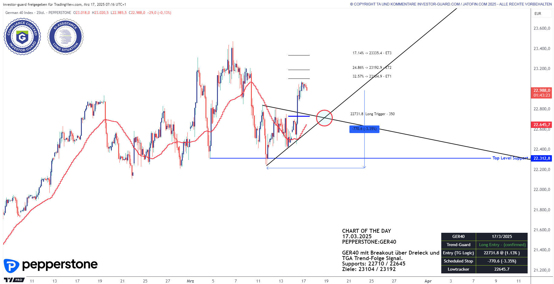 Support sehe ich zusammenfassend bei 22.710 und 22.645 ✔️ Punken. Ziele auf der Oberseite warten bei 23.104 und 23.192 ❌ Zählern.