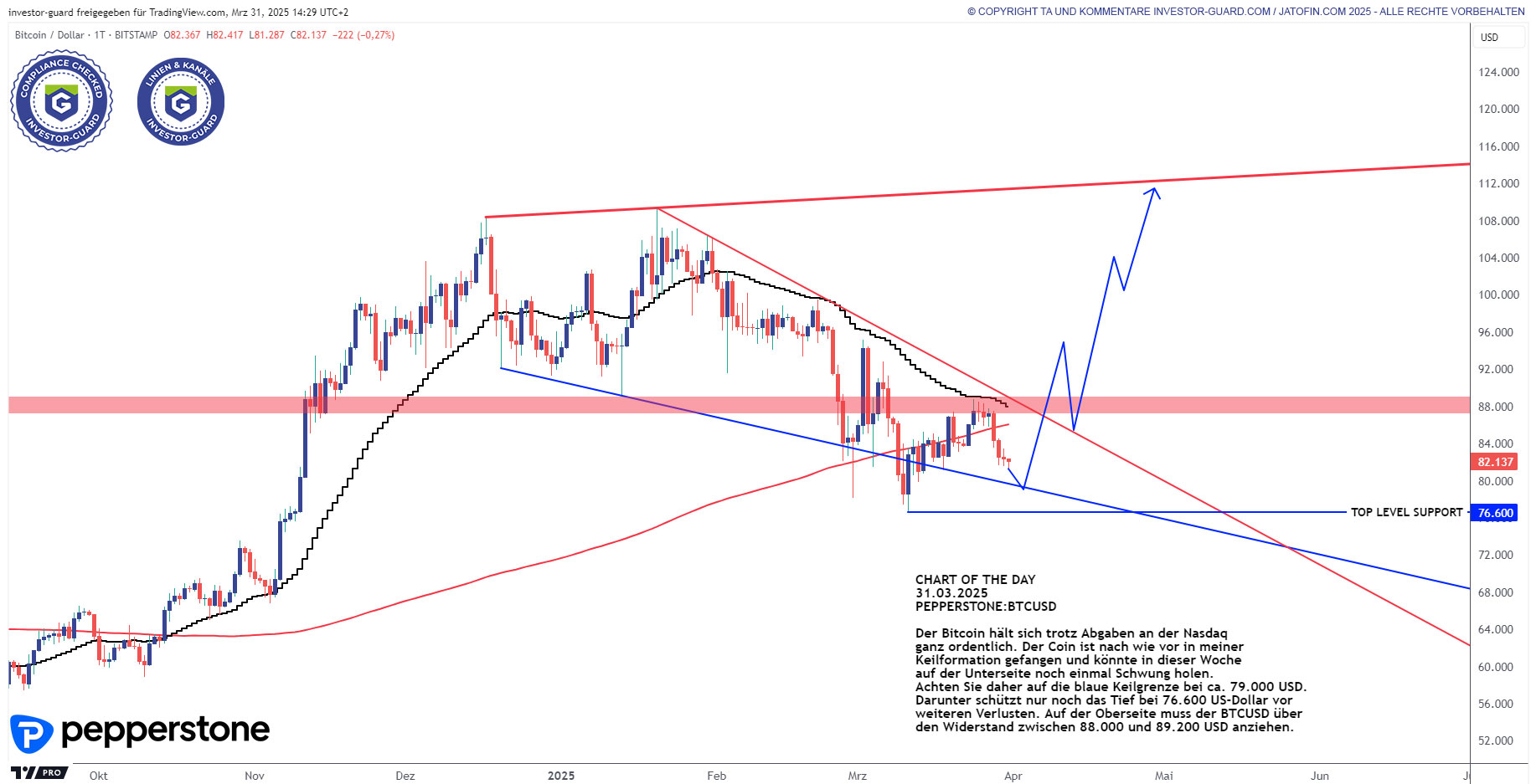 Tja, wie schon in meinem Wochenkommentar geschrieben, ist die Stimmung an den Aktienmärkten so ziemlich mau... Die "trumpschen Zollmanöver" schlagen immer mehr auf die Wirtschaftsdaten durch, was u.a. auch vom Chef der US-Notenbank bestätigt wurde. Fakt ist, dass die letzten Tiefpunkte im Dow Jones & Co wieder zur Disposition stehen. Ich gehe davon aus, dass die Wall Street unterhalb der Schlussstände vom letzten Freitag eröffnet. Auch der Dax steht im frühen Geschäft unter Druck. Dies betrifft den Bitcoin ebenso, den ich heute für im Chart of the Day unter die Lupe nehme.