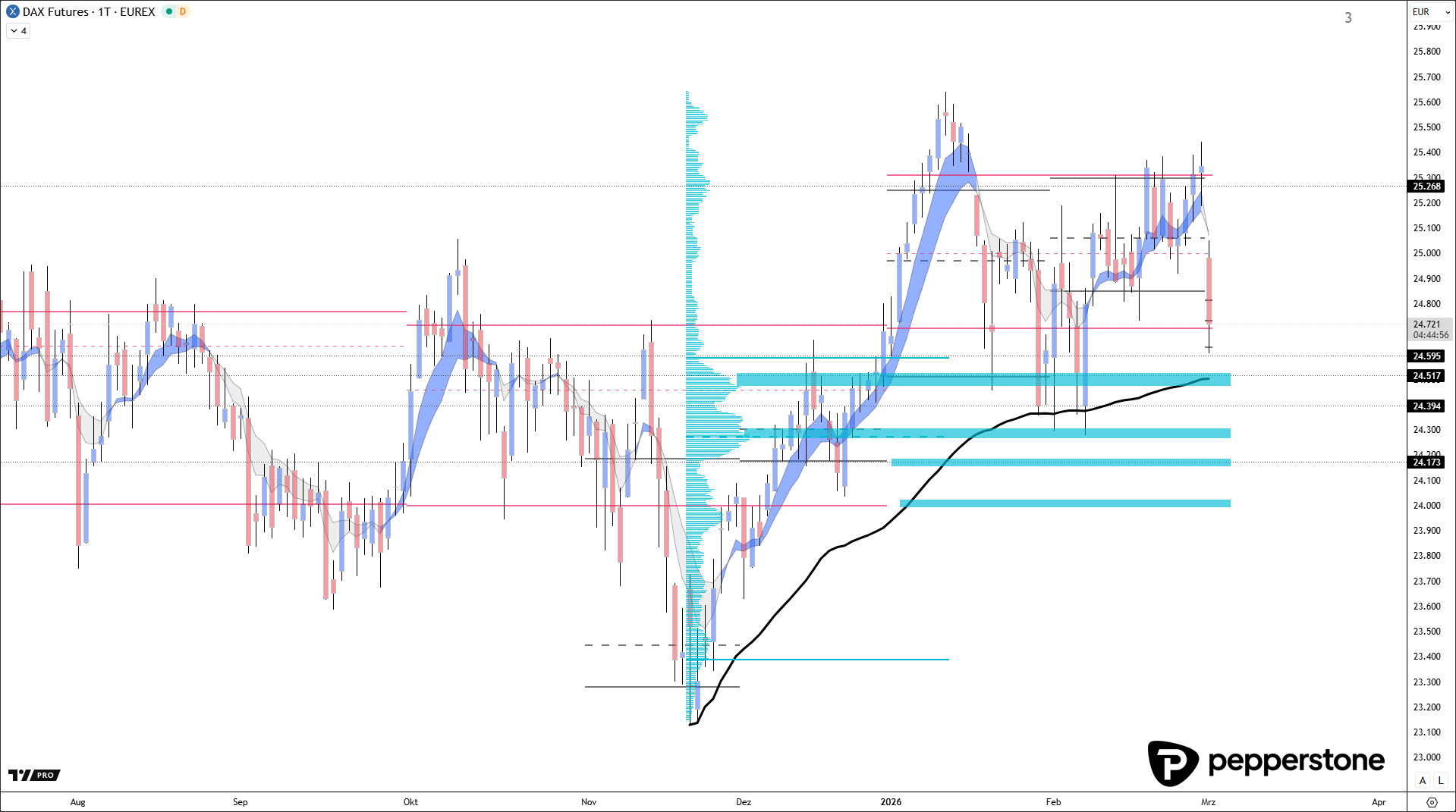 Für den kurzfristigen Verlauf fokussiere ich drei, optional vier Unterstützungsbereiche. Erstens die High Volume Node um ~24.500 Punkte (rund), kombiniert mit einem volumengewichteten Durchschnitt (VWAP/Anchor), geankert auf den Rallye-Start 19.11.25 – für mich eine zentrale Referenz, weil dort Positionierung typischerweise neu sortiert wird. Zweitens die nächste High Volume Node um ~24.300 Punkte. Drittens ein enges Cluster aus Value Area Low (Dezember) und Value Area High (November) – ein Bereich, der häufig als Übergangszone zwischen „faire Preisfindung“ und „weiterer Abverkauf“ fungiert. Optional als vierte Marke kommt die Value Area Low des Vorquartals hinzu, falls der Markt tiefer in die Struktur greifen sollte. Entscheidend ist weniger die exakte Linie, sondern das Zusammenspiel dieser Zonen als Cluster.