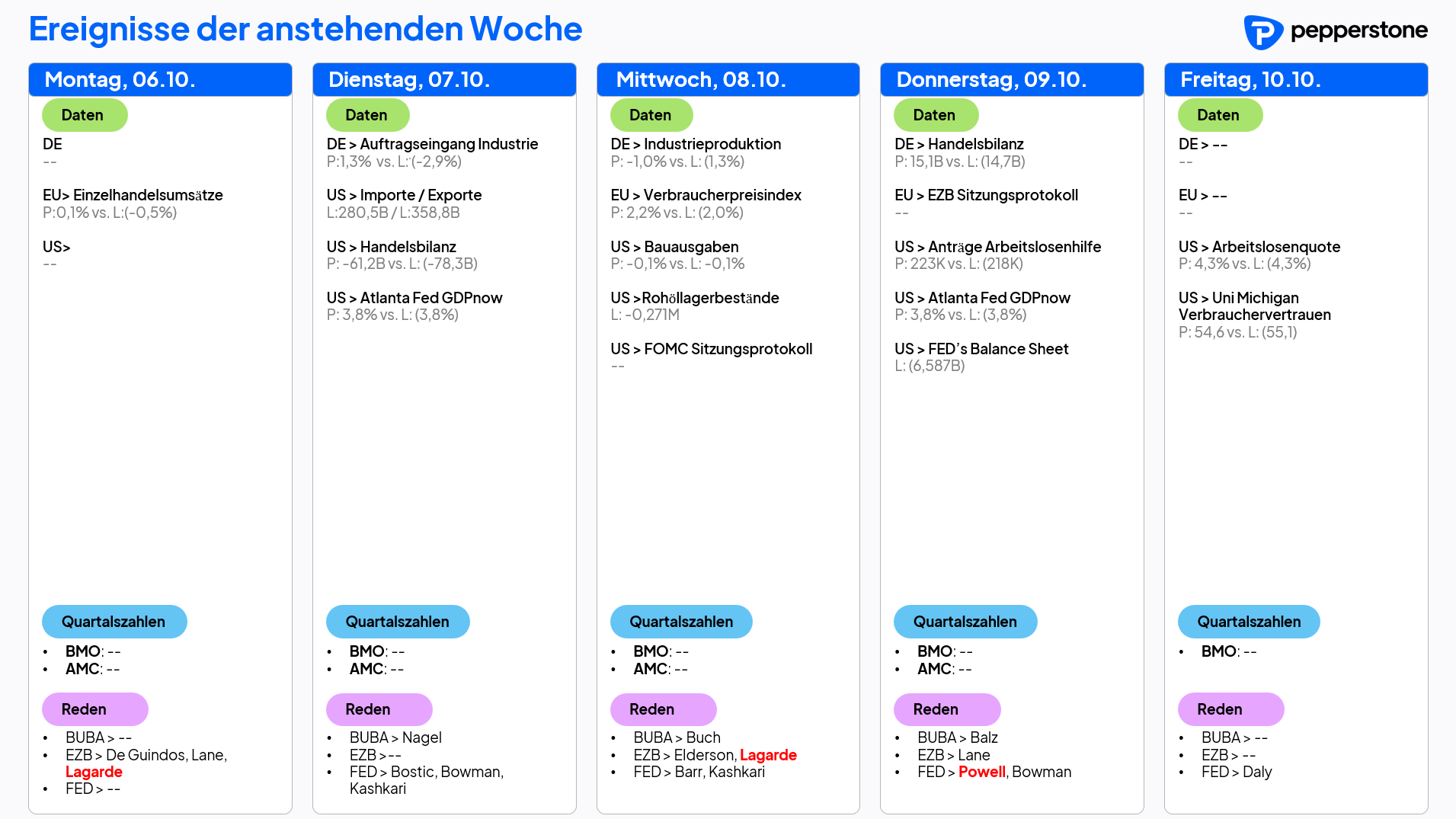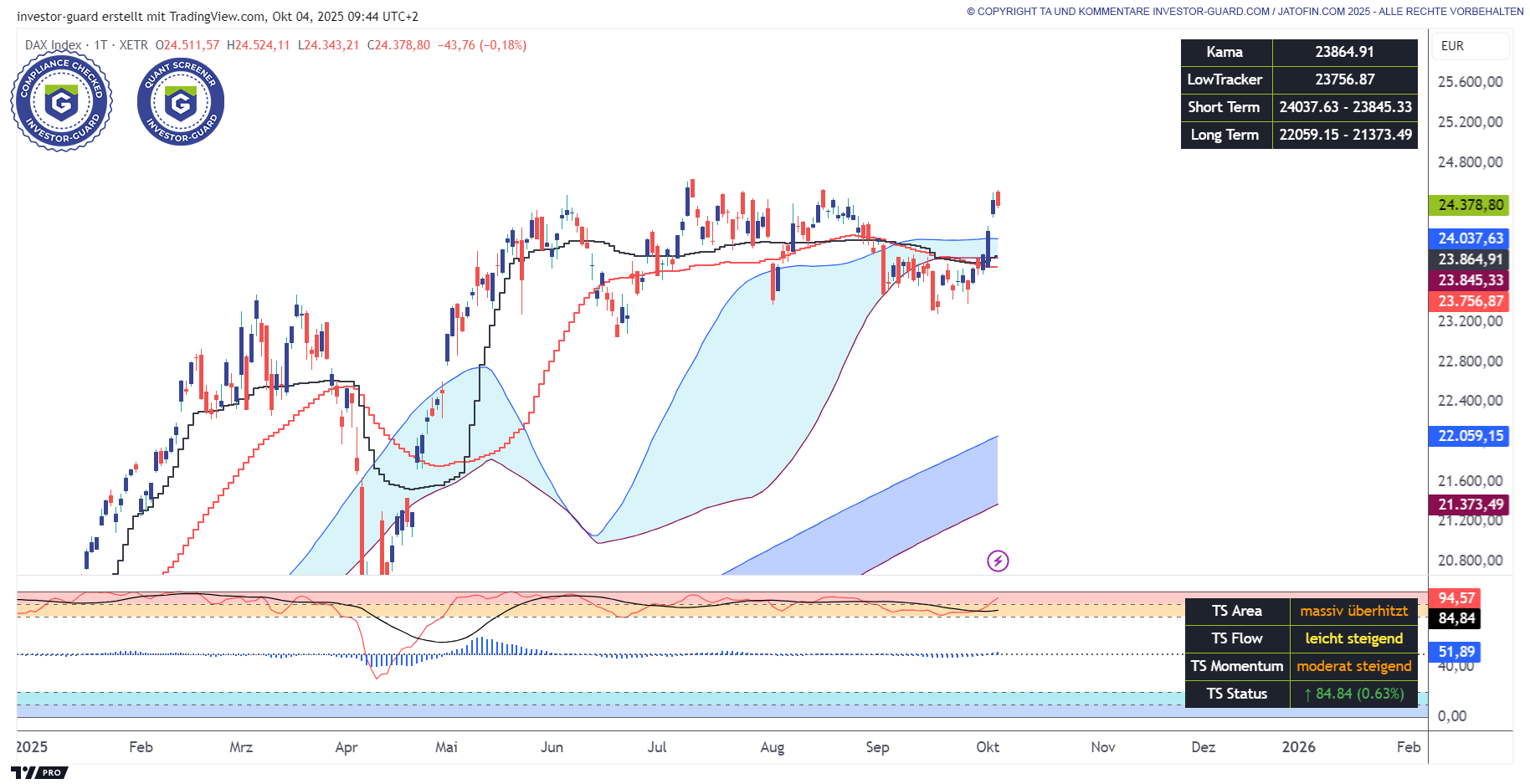 einen schönen guten Morgen am Montag, den 06. Oktober 2025. Die USA starten mit dem teilweisen Shutdown in die neue Handelswoche 41. Die erste Woche des neuen Quartals beginnt mit Aktien- und Cryptomärkten auf Allzeithoch. Der Dax könnte in dieser Woche ebenfalls auf ein neues Top nachziehen.