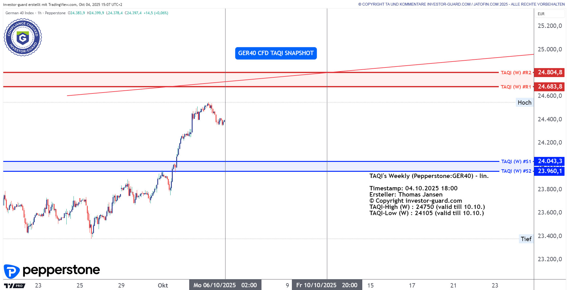 Der DAX (GER40 CFD) ging nach der Verteidigung des Supports über die relevanten Widerstände. Der Angriff auf die 24.000-Punktemarke ließ nicht lange auf sich warten. Der mehrfache Widerstand wurde klar und nachhaltig überwunden. Auch das zuletzt schwache ausgeprägte Momentum zog an. Für die Handelswoche 41 rechne ich mit einem Schub über das Allzeithoch, in dessen Folge auch der Bereich um 24.850 bis 25.165 Punkte erreichbar sein könnte.