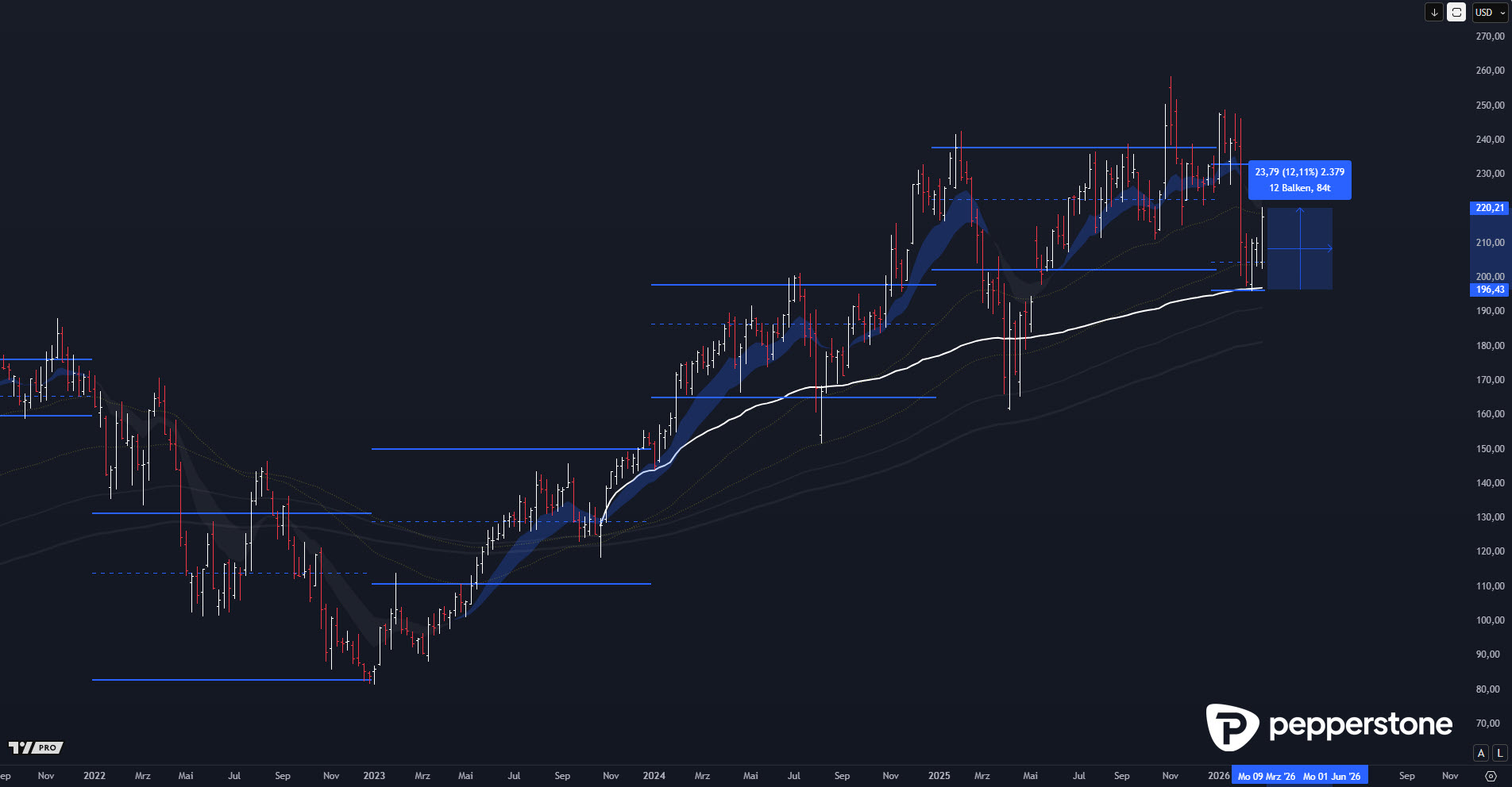 Mit dem Impuls verschiebt sich die Aufgabe nun vom „Support handeln“ hin zum strukturierten Re-Entry-Plan. Sollte es zu Rückläufen kommen, ist vor allem der Bereich 207 bis 210 USD hochrelevant, weil dort ein sinnvoller Einstieg aus einer untergeordneten Korrektur in den übergeordnet laufenden Impuls möglich wird. Genau diese Pullback-Logik ist in starken Trends oft der sauberste Weg, um das Chancen-Risiko-Profil wieder zu normalisieren, statt nach dem Anstieg nur noch teure Breakout-Käufe zu erzwingen.
