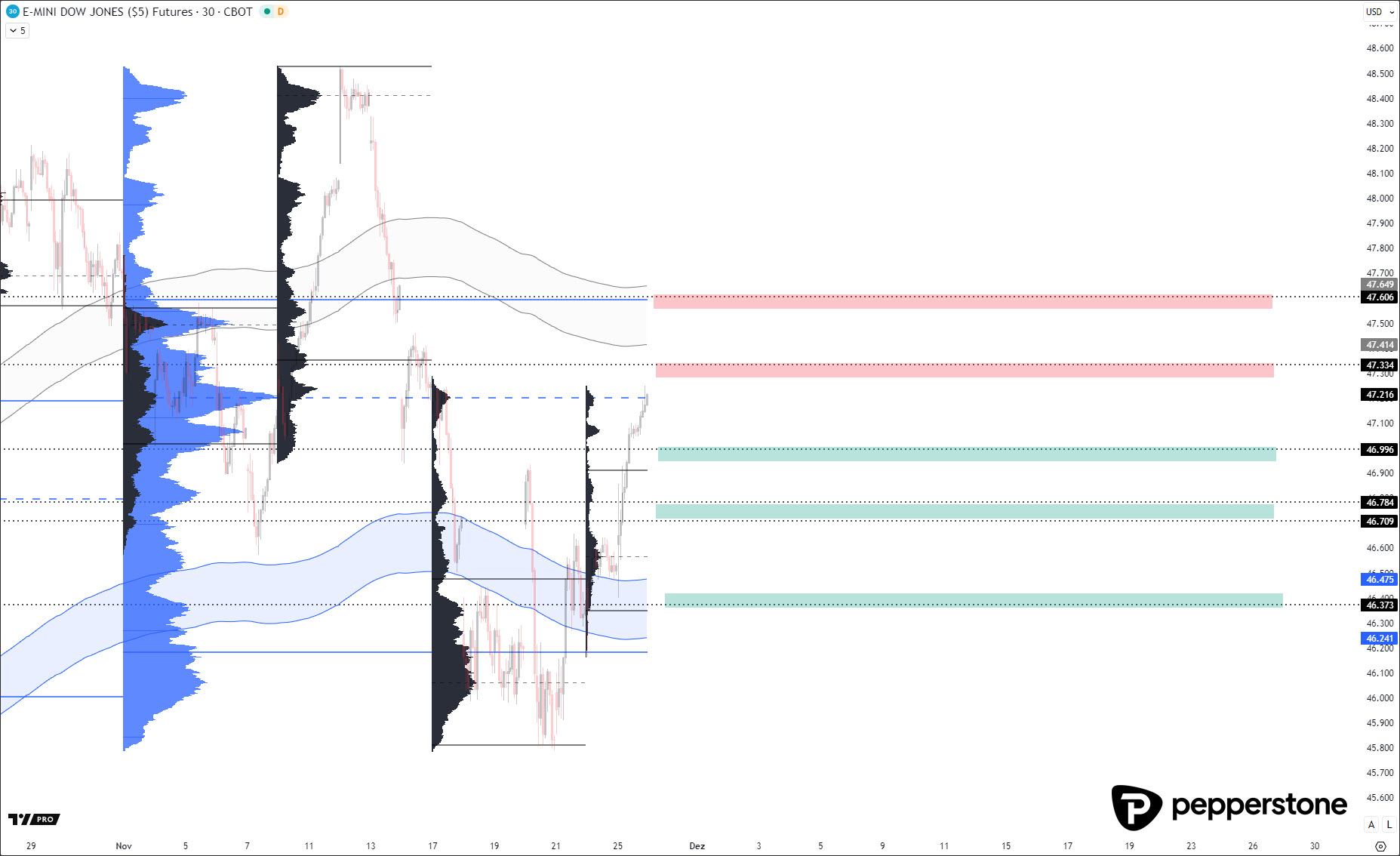 DOW JONES PROGNOSE: Im heutigen Handel besitzt der Dow Jones zwei entscheidende Widerstände auf der Oberseite – 47.340 und 47.590 Punkte. Die erste Unterstützung befindet sich an der H4-EMA 10 zusammen mit der Monats-VWAP bei etwa 46.990 Punkten, gefolgt von der Zone aus H4-EMA 20 und Wochen-VWAP zwischen 46.700 und 46.780 Punkten. Eine weitere, tiefere Unterstützung lässt sich bei 46.360 Punkten verorten. Diese Marken sind als potenzielle Reaktionszonen zu verstehen, nicht als Prognosen – erst eine untergeordnete Bestätigung über die Preisstruktur entscheidet, ob sich daraus ein technisch sauberes und risikoarmes Setup ergibt.