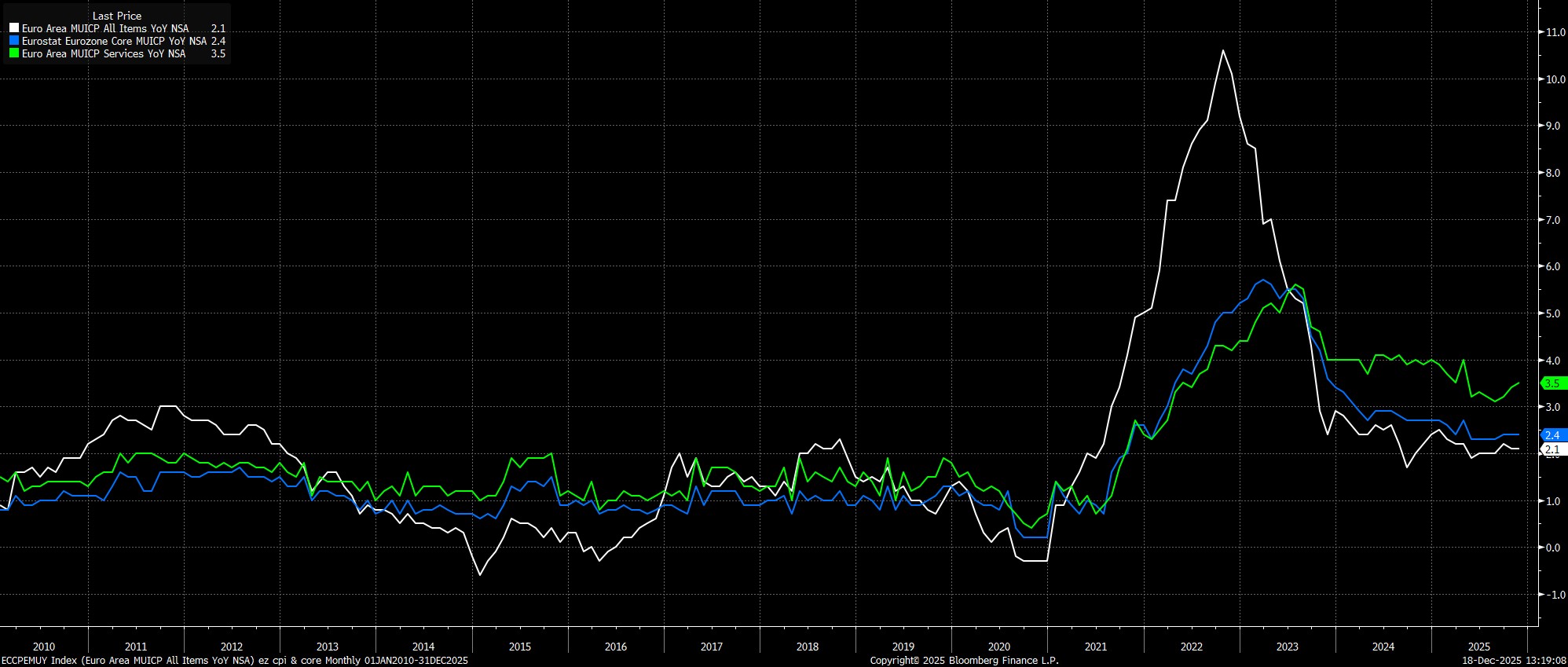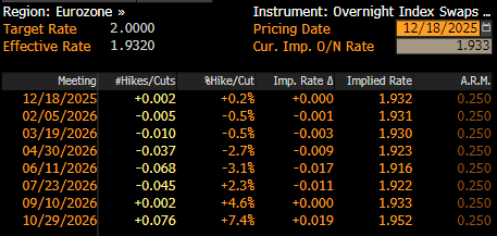 As alluded to, and as had been fully discounted by money markets, the Governing Council held all policy settings steady at this year’s final meeting, with the deposit rate hence being maintained at 2.00%. Such a decision extends the pause that has now been in place since the June confab, and helps to further support the idea that the easing cycle has now come to an end, with 2.00% marking the terminal rate.