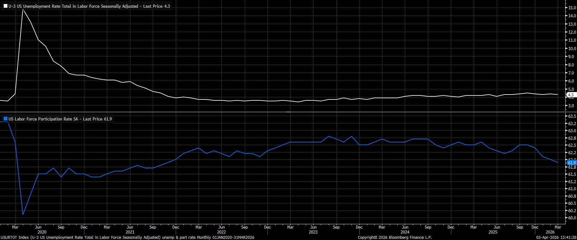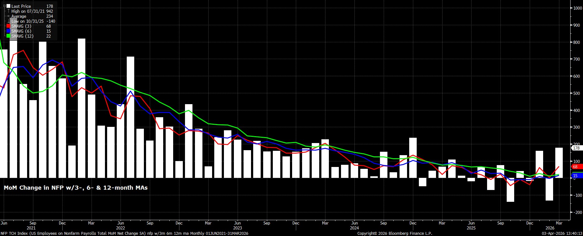 Along with the March print, the prior two payrolls figures were revised by a net -7k, marginal in the grand scheme of things, subsequently taking the 3-month average of job gains to +68k, just a touch above the breakeven rate.