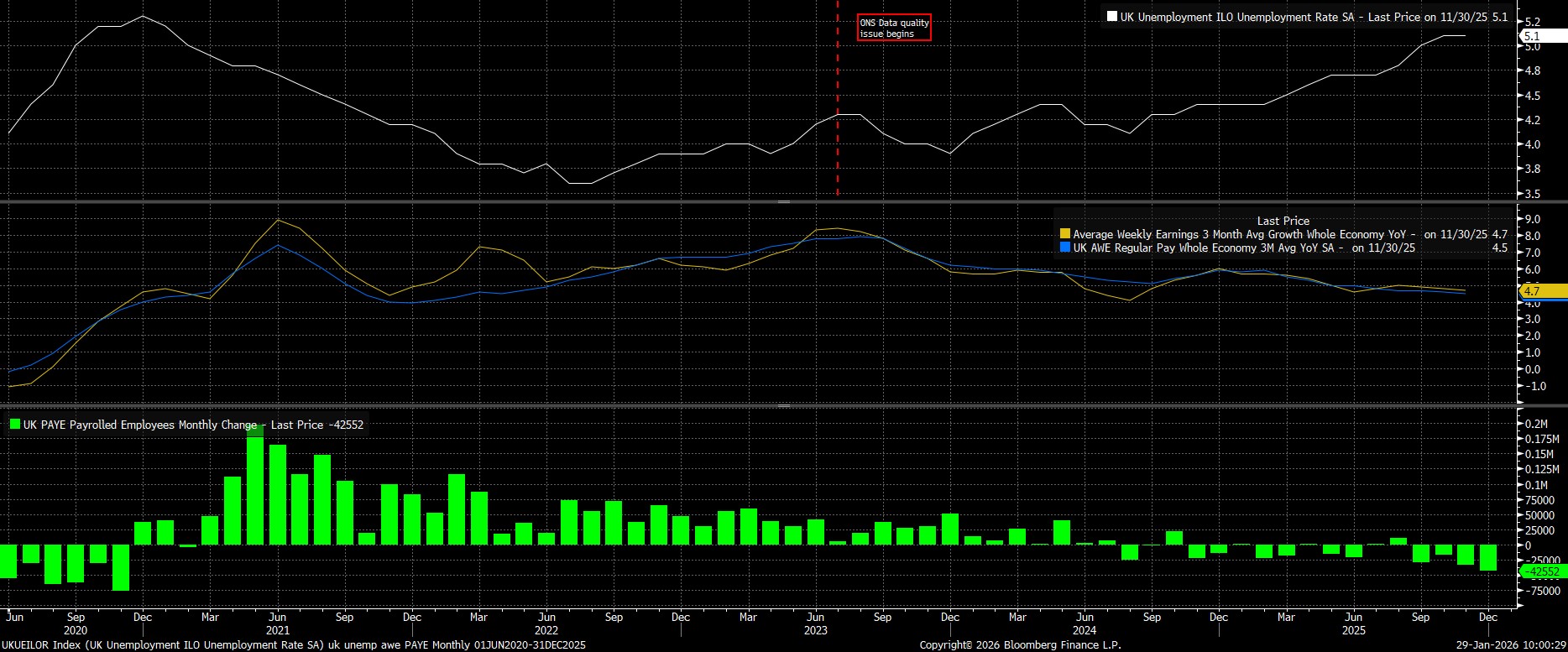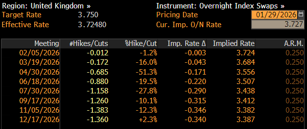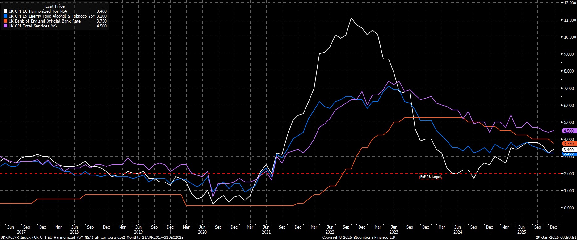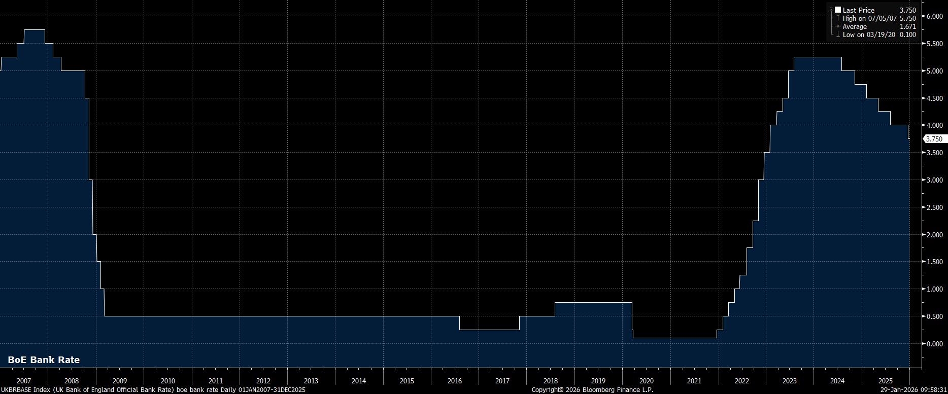 As noted, the MPC are set to hold Bank Rate steady at 3.75% at the conclusion of the first policy meeting of 2026, having delivered a 25bp cut at the prior meeting last December.