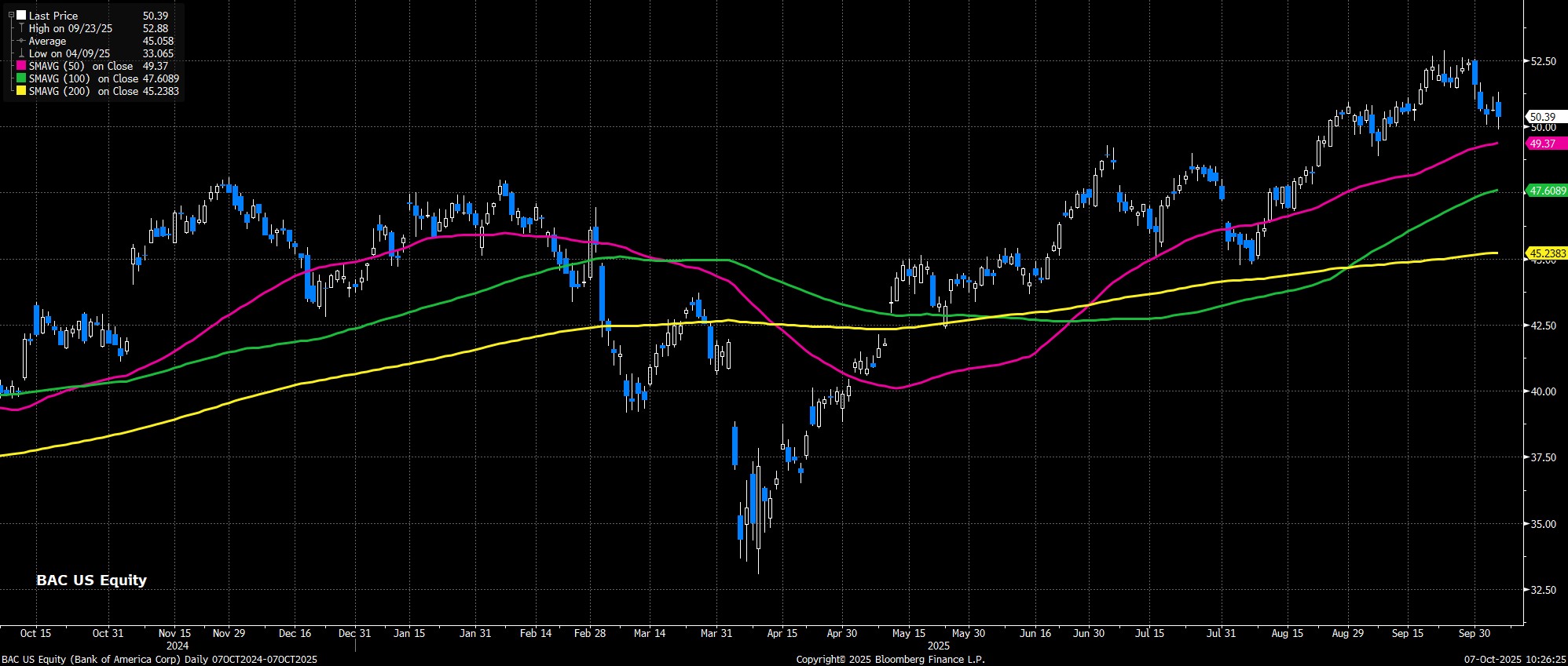 In contrast to peers where trading revenues have made-up for lacklustre retail performance, Bank of America has lagged the pack this year, trading around 15% higher in 2025, mirroring to some extent the underperformance of its other retail-focused counterpart Wells Fargo. Still, despite that rather unimpressive performance, BofA remains comfortably within the largest 25 stocks in the benchmark S&P 500. For the upcoming earnings release, options tied to the stock price a move of +/-3.6%, though recent post-results performance has been somewhat mixed with 2 gains and 2 losses following the last four earnings releases. This time out, consensus expects adjusted EPS at $0.94, on revenues of $24.5bln.