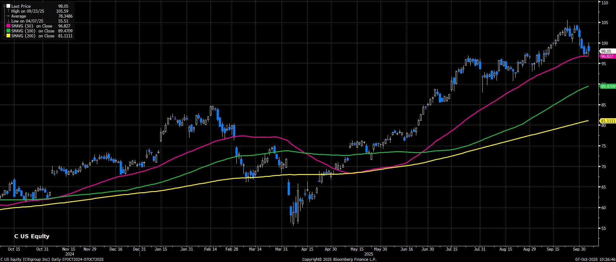 Citi has also traded well in 2025, having also gained around 40% since the turn of the year, again vastly outperforming the benchmark S&P 500, and the financials sector. From a weightings perspective, Citi stands as the 59th largest stock in the S&P, accounting for a modest 0.3% of the benchmark. For the upcoming release, options tied to the stock price a move of +/-4%, with C having ended earnings day in the green following the last three quarterly reports in a row. In Q3 25, consensus expects adjusted EPS at $1.89, on net revenues of $21bln.