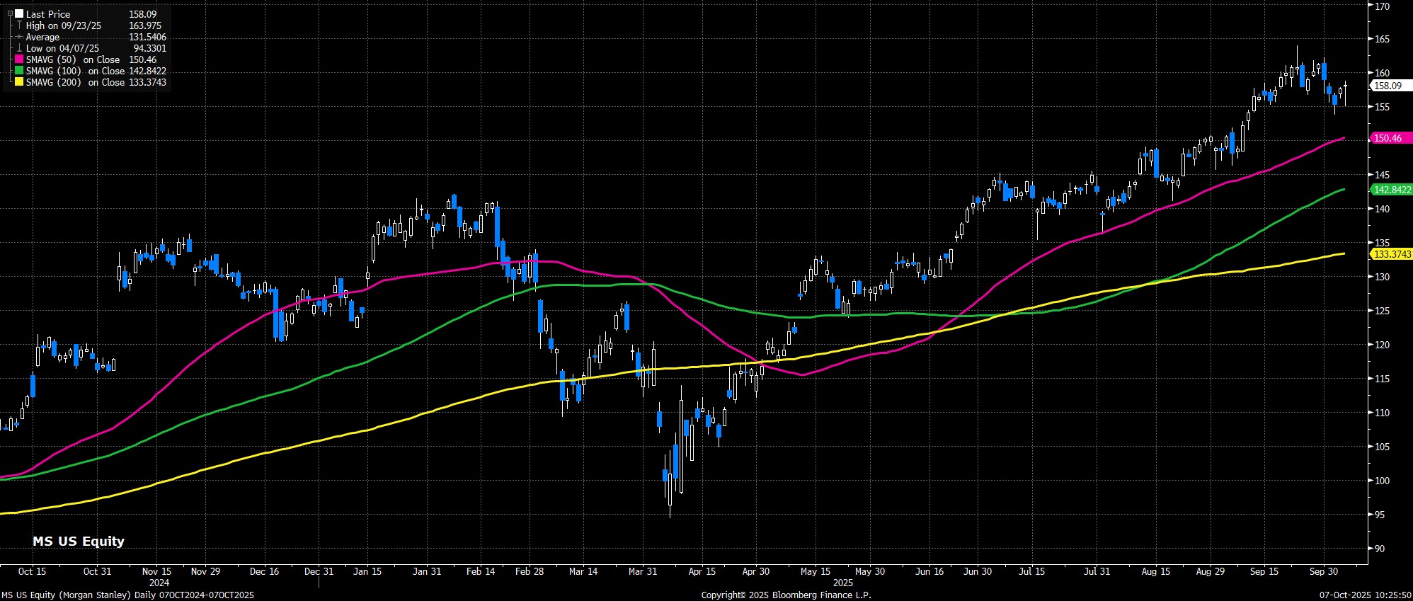 Morgan Stanley has advanced around 26% this year, also comfortably outperforming financials, as well as the broader S&P 500. From a weightings perspective, the stock still stands as the 35th largest in that benchmark, with a weight of around 0.4%. Derivatives tied to MS stock price a move of +/-3.75% over the upcoming release, with the Q2 25 report marking the first post-earnings sell-off in MS stock since the tail end of 2023. For the upcoming print, consensus expects adjusted EPS at $2.08, on revenues of $16.5bln.