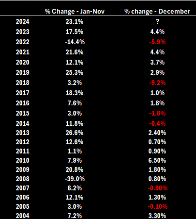 The fact that the S&P500 has gained 24.7% YTD, subsequently increases the prospect of a chase by active managers into year-end and raises the prospects of seeing “Santa” used more liberally in market commentary. It also suggests a need for pension funds, mutual funds, and sovereign wealth funds to rebalance, and that may be countering force to those chasing performance into year-end.