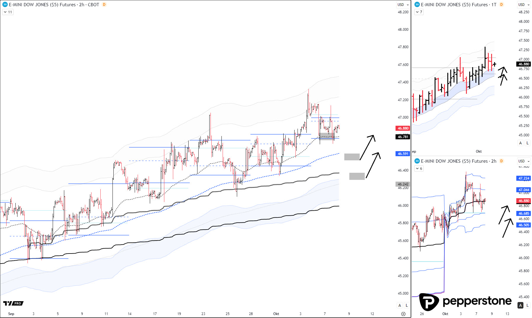 DOW JONES PROGNOSE: Der DOW JONES bleibt weiterhin in steigender Handelsausrichtung, allerdings momentan in einer Korrektur. Diese verläuft ohne viel Momentum seitwärts. Tiefere Orte werden interessant für Impulse im Rahmen des laufenden Trends. Untergeordnet gibt es für den Handelstagen weitere Handelsmarken.