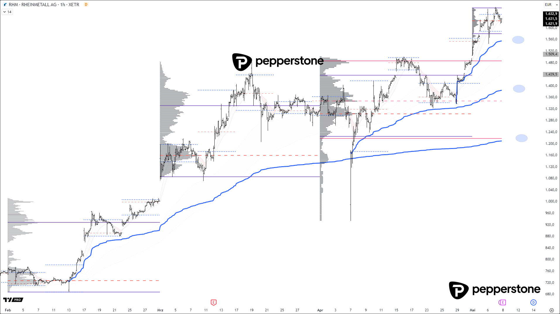 Viele Trader begehen den Fehler, impulsive Bewegungen zu jagen – also dort zu kaufen, wo der Kurs „sich stark anfühlt“. Doch genau das führt häufig zu schlechten Einstiegsniveaus. Ich warne davor, in den laufenden Aufwärtsimpuls der Rheinmetall-Aktie „hineinzukaufen“.