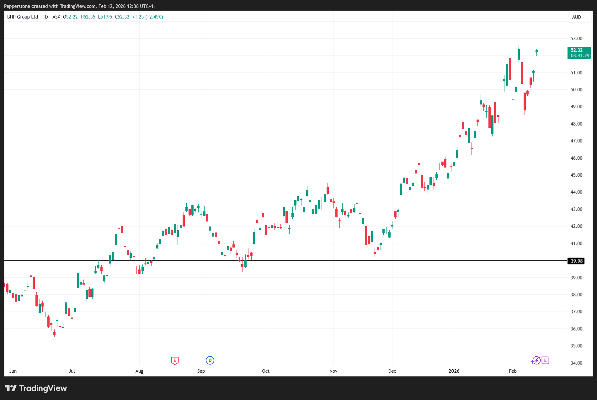 The bid remains firmly in materials, with gold and copper names outperforming. BHP is back above $52 and testing its all-time high of $52.54, as traders position ahead of Tuesday’s FY2026 earnings report. With metals prices holding firm and capital flowing back into resource names, the sector continues to provide structural support to the broader index.